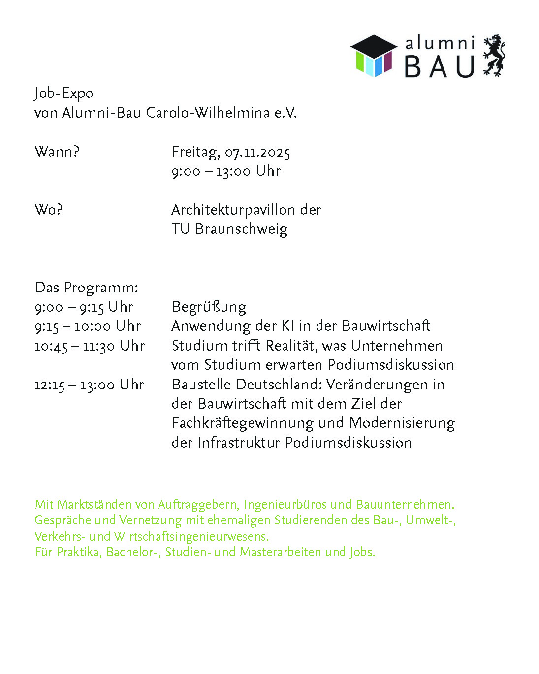Das Besondere: Alle Firmen und die meisten Ansprechpartner sind Mitglieder im Netzwerk Alumni-Bau Carolo Wilhelmina, Eurem Alumni-Verein der Ingenieurstudiengänge der Fakultät 3 der TU Braunschweig.
