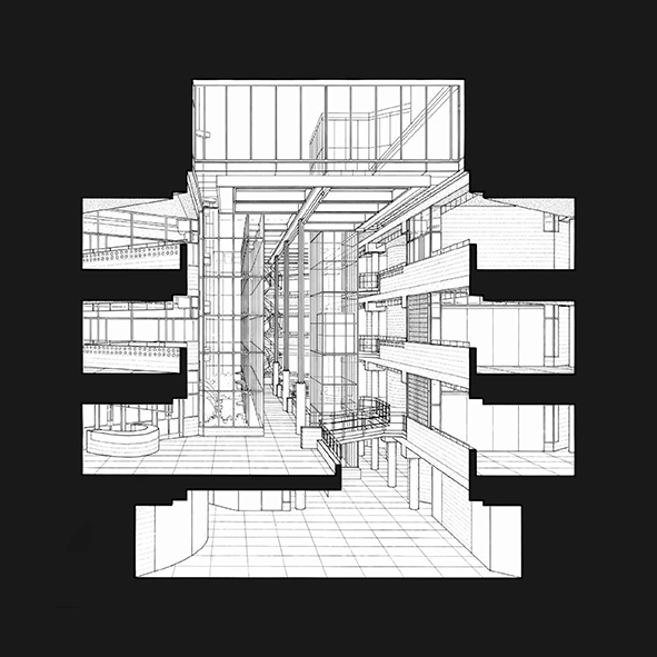 As with many Structuralist buildings, the building’s qualities lie in striking a balance between the individual and the community, and these qualities become apparent when experiencing the interior. However, the relationship with the public realm has been largely ignored. The building reveals itself as a hermetic interior world, isolated from the surrounding urban space. The main entrance is barely identifiable; there is no clear address and no welcoming gesture. However, the size of the building, which occupies an entire city block, calls for uses that are open to the public. The Bachelor’s thesis addresses this issue. It focuses on the main entrance of the building complex—which has been temporarily vacant and is now threatened with demolition—as a critical interface between the city and the internal structure.
