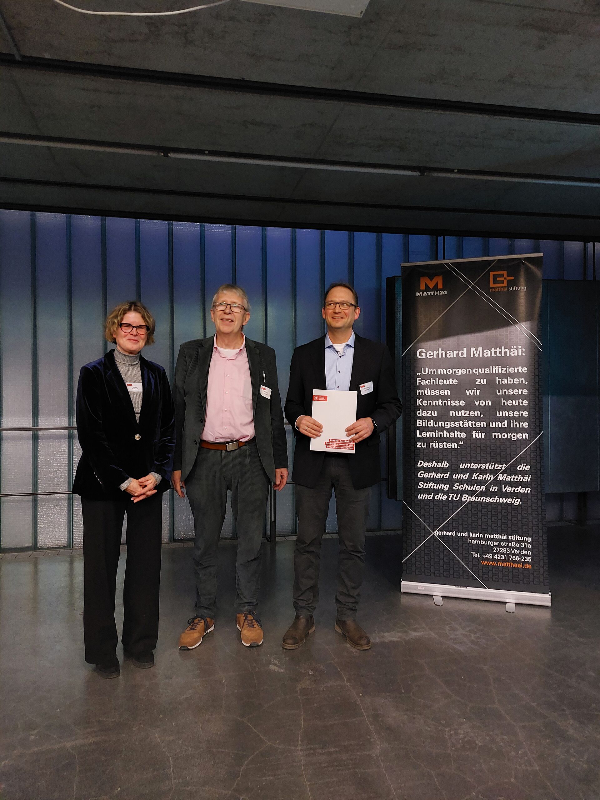 Überreicht wurde der Preis von der Dekanin der Fakultät 3 Frau Prof. Dr. sc. Antje Schwalb (links) und dem Vorstandsvorsitzenden der Matthäi-Stiftung Herr Hinrich Tjaden (mitte). Entgegengenommen hat den Preis stellvertretend Herr Dr.-Ing. Thorsten Leusmann (rechts).