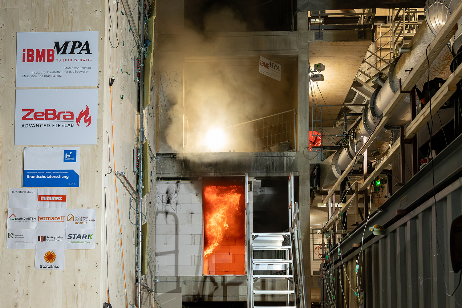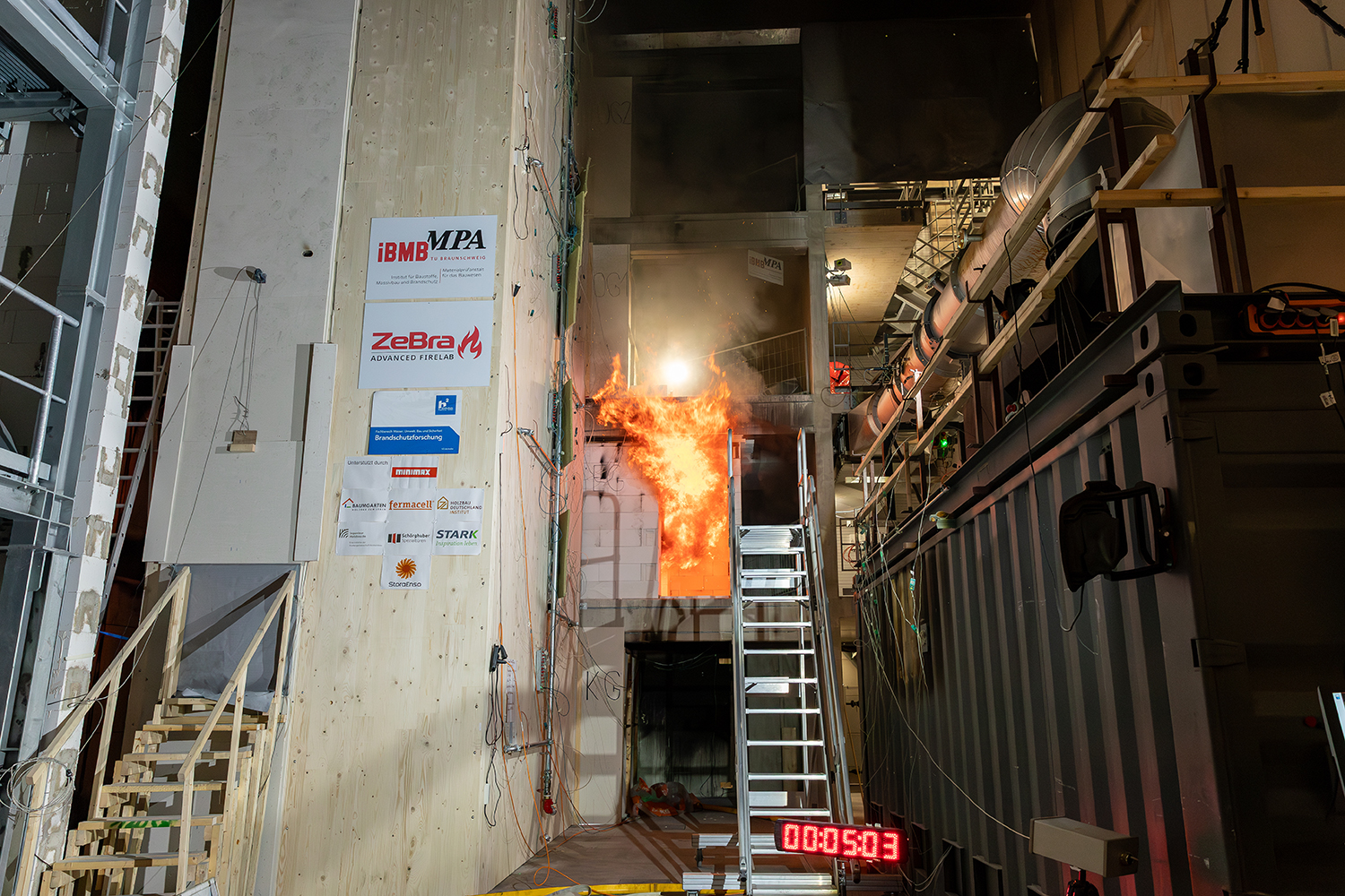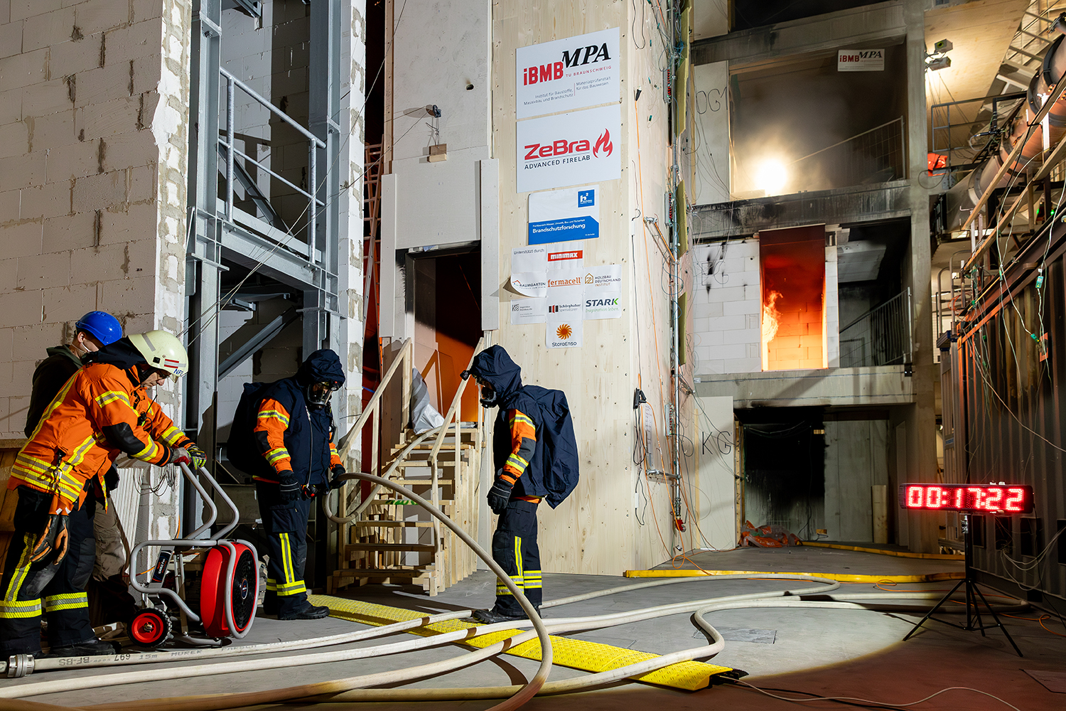 Für die Experimente im Realmaßstab wurde an das sogenannte Brandhaus im Zentrum für Brandforschung der TU Braunschweig ein viergeschossiger, rund zwölf Meter hoher Treppenraum angebaut. In jeder Etage verbinden zwei Türen das Treppenhaus direkt mit einem angrenzenden Raum im mehrgeschossigen Brandhaus, in dessen erster Etage der Brand entfacht wurde.