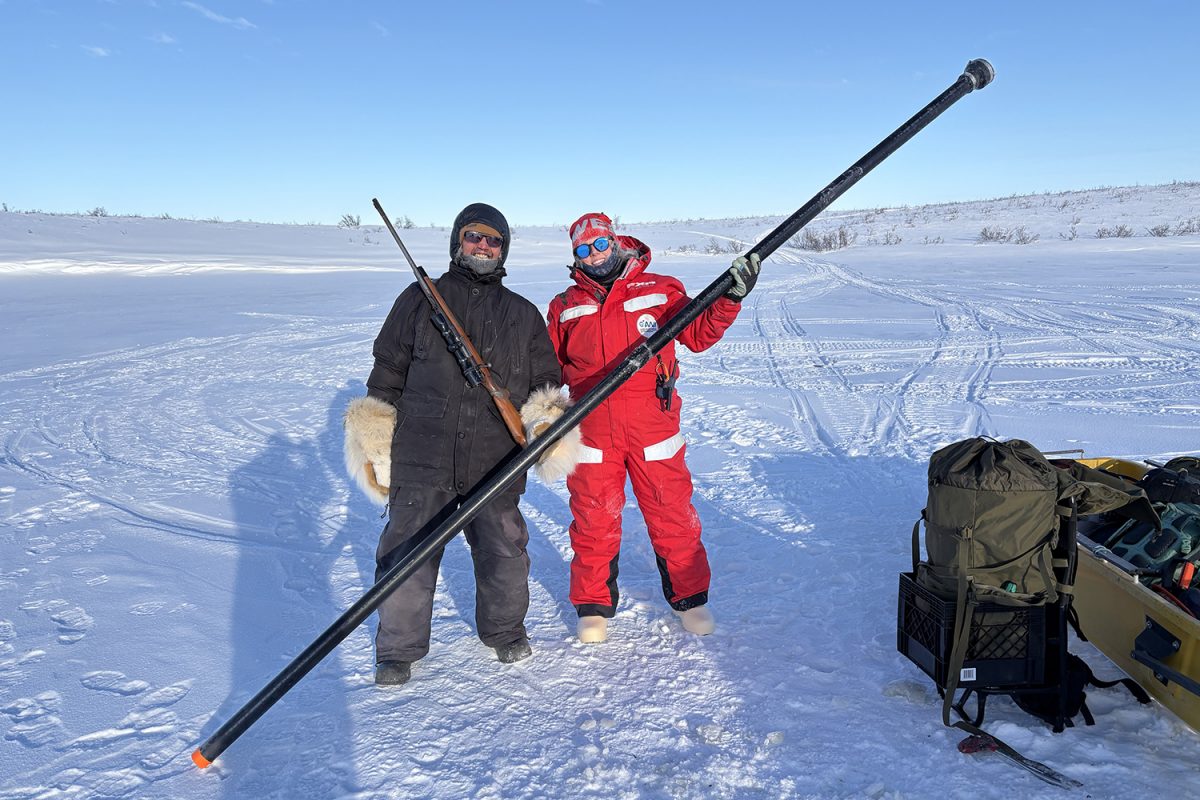 Bei -40 Grad Celsius fror Camerons eigentlicher Sedimentkernbohrer ein. Die Lösung: Ein selbstgebauter Ersatz mit Materialien aus dem lokalen Baumarkt. Neben Cameron steht der einheimische Wildtierbeobachter Miles Dillon. Bildnachweis: Moritz Langer/Vrije Universiteit Amsterdam.