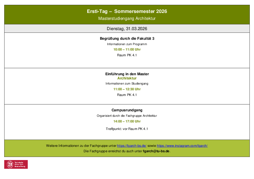 In der Einführungsveranstaltung am 31.03.2026 bekommt ihr erste Informationen zu eurem Studium, zu unseren Instituten sowie zu der Universität und ihren Einrichtungen. Ihr lernt auch einige eurer Lehrenden kennen sowie eure Ansprechpersonen in der Geschäftsstelle. Bei einem Campusrundgang stellen wir euch wichtige Orte wie die Institute des Departments Architektur, Zeichensäle, Modellbauwerkstatt, Studierendenhaus und Architekturpavillon vor.