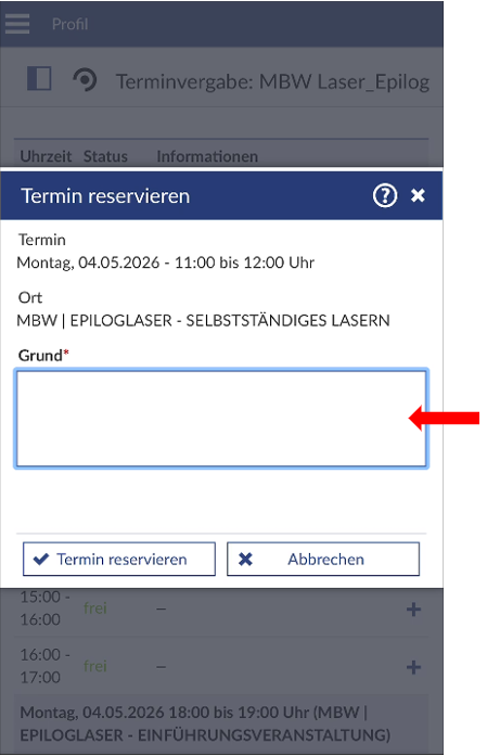 Hier hast du die Möglichkeit, deine Termine für das selbstständige Lasern auf unseren Epilog-Lasern über unsere Website zu buchen.