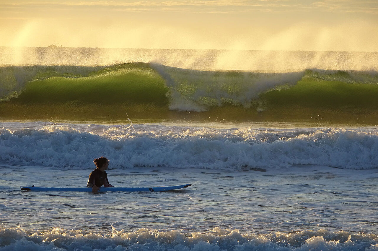 Es war immer noch dunkel, als meine Freunde mit ihren Brettern in die Wellen gingen. Ich stand an Land, umgeben von Stille, und beobachtete die erwartungsvollen Surfer. Als das Licht kam, kamen auch die ersten stärkeren Wellen und ich drückte den Auslöser. Der Moment war so vergänglich, wie die Gischt, die vom ersten Sonnenlicht in goldenen Staub verwandelt wurde. Die Gischt, die im Morgenlicht leuchtet und dann wieder zerfließt, genau wie der Moment, der erglüht und wieder in sich zusammenfällt. Und doch bleibt er.