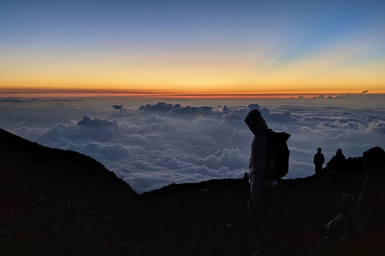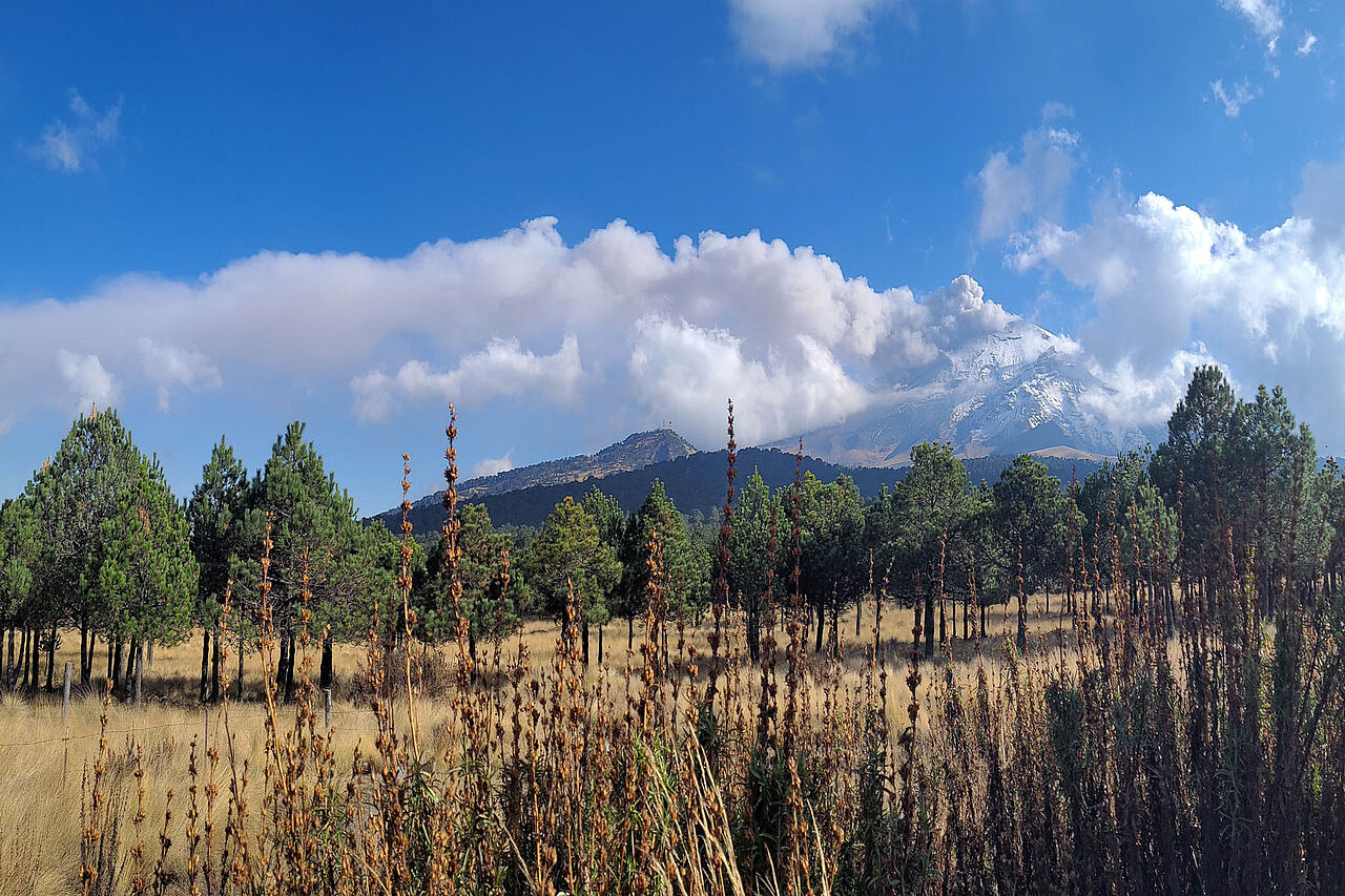 Bei unserem Besuch in Mexiko hatten wir die Möglichkeit, eine Exkursion zum beeindruckenden Popocatépetl zu unternehmen. Eine wundervolle Wanderung vom Paso de Cortes aus führte uns auf bis zu 4200 m Höhe über dem Meeresspiegel durch die Kiefernwälder und die beeindruckende Graslandschaft oberhalb der Baumgrenze (Zacatonal) zum Fuß des benachbarten Vulkans Iztaccíhuatl ("schlafende Frau"). Über den Tag konnten wir passend zu unserem Forschungsprojekt beobachten, wie dynamisch die Atmosphäre im Bereich solcher hoher Berge ist, denn es entwickelten sich mächtige Quellwolken über dem Vulkan und auch die Aktivität des gewaltigen Vulkans nahm deutlich zu. Das Foto entstand am Nachmittag und zeigt den spektakulären Moment, als sich der Popocatépetl in Wolken hüllte und gleichzeitig große Mengen Rauch und Asche ausstieß, die sich mit dem Höhenwind zu einer langen grauen Rauchfahne in der Atmosphäre entwickelten. Die Wanderung im Nationalpark war ein echtes Highlight und hat den Besuch zu einem beeindruckenden und lehrreichen Erlebnis gemacht, das wir so schnell nicht vergessen werden!