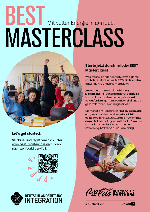 Schule oder Uni fertig! Und jetzt? Was passt zu mir? Reichen meine Fähigkeiten aus? Woher bekomme ich Tipps? Viele junge Menschen fühlen sich mit diesen Fragen überfordert. Gerade Menschen mit Migrationsbiografien oder aus Familien mit wenig formaler Bildung fehlen oft Informationen, Vorbilder oder Ansprechpersonen. In Kooperation mit Coca-Cola Europacific Partners und mit Unterstützung von LinkedIn haben wir die BEST Masterclass ins Leben gerufen, um das zu ändern: Mit digitalen Vorbilder-Talks und Online-Trainings empowern wir junge Menschen, ihre Stärken zu entdecken, ihren eigenen Weg zu finden und voller Selbstvertrauen durchzustarten.