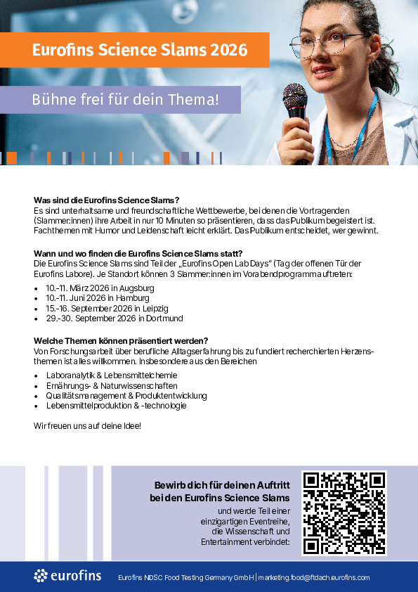 Die Eurofins Science Slams sind Teil der „Eurofins Open Lab Days“ (Tag der offenen Tür der Eurofins Labore). Je Standort können 3 Slammer:innen im Vorabendprogramm auftreten: