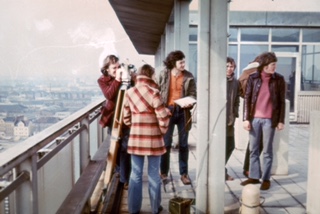 Instead of the regularly expected 5-6 geodesy students, the newly introduced numerus clausus in civil engineering meant that almost 30 enrolled students attended the opening event on the "measuring roof" of the high-rise building in autumn 1973. Among them were also "girls"! - unthinkable for the teaching staff until then. The institutes were initially overwhelmed. The newly acquired 6 pocket calculators (basic arithmetic operations) could not be made available to the students. In the first few months, calculations were carried out using logarithms or mechanical crank calculators.