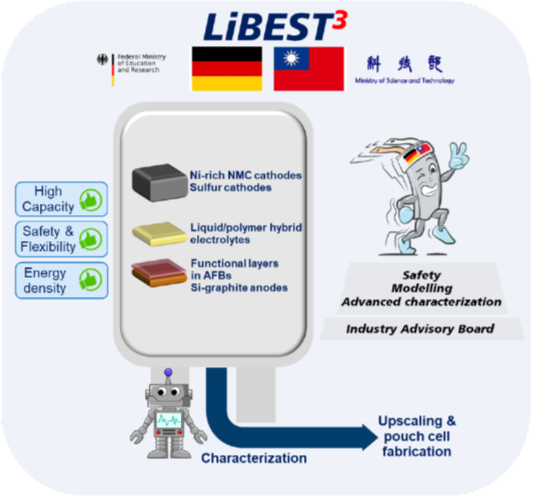 The LiBEST3 project targets the development of high-capacity, scalable, and safe lithium-ion batteries through the integration of innovative materials and concepts. These include silicon based (Si) anodes, composite lithium sulfide (Li₂S), Ni-rich layered oxide cathodes (NCM), and anode-free battery (AFB) configurations. A primary goal is to optimize these advanced materials and assess their electrochemical performance and scalability in pouch cell prototypes, laying the groundwork for future commercial deployment of next-generation battery chemistries.