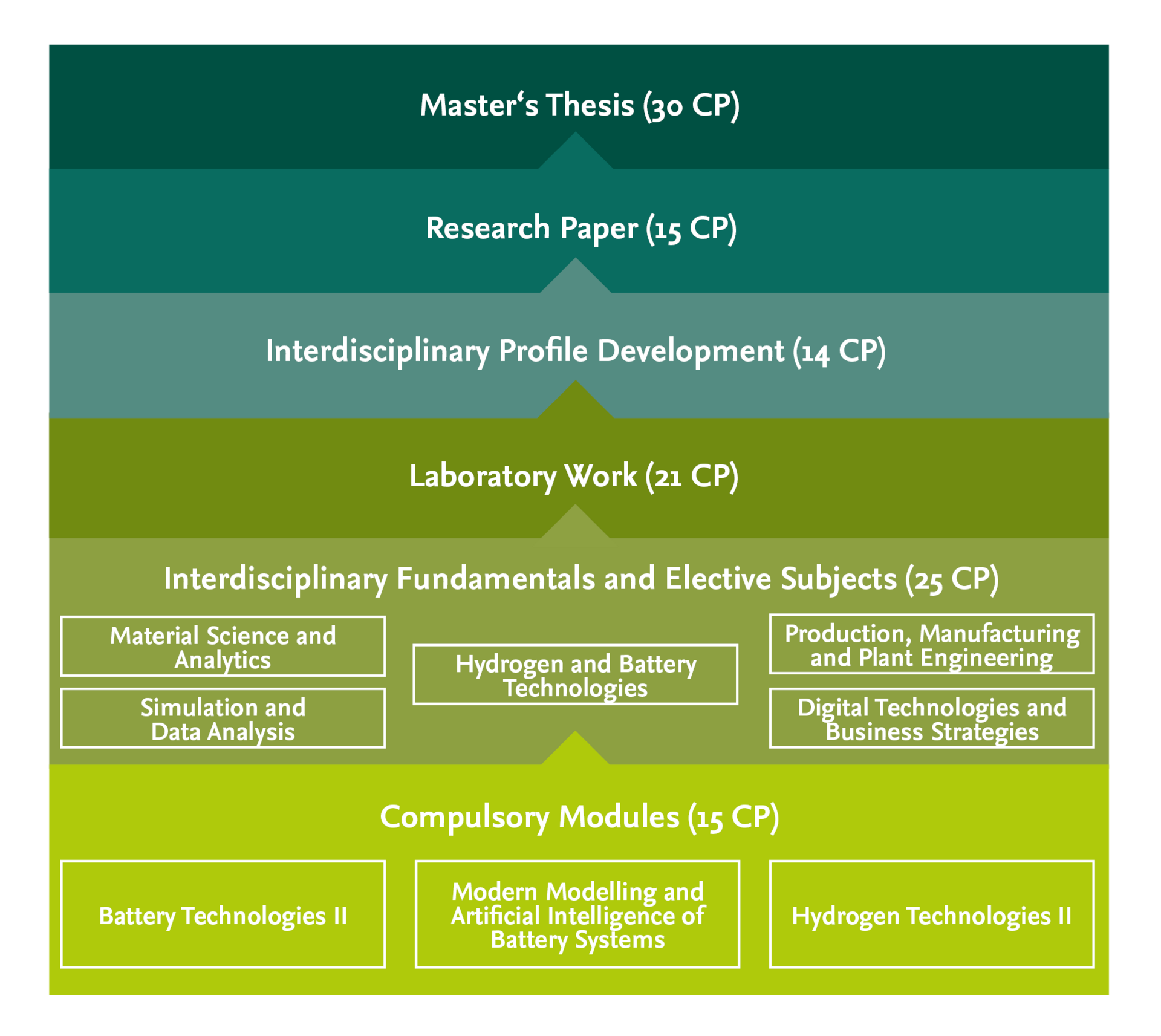 On the Master's programme, students take three compulsory modules in English. These modules build on the fundamentals of battery and hydrogen research, forming the basis for the rest of the programme. The majority of the programme, however, consists of optional courses that students can select according to their own interests. Thanks to the wide range of options available, each student can create their own personalised programme of study and thus develop their own specialisation, depending on their interests and linguistic strengths.