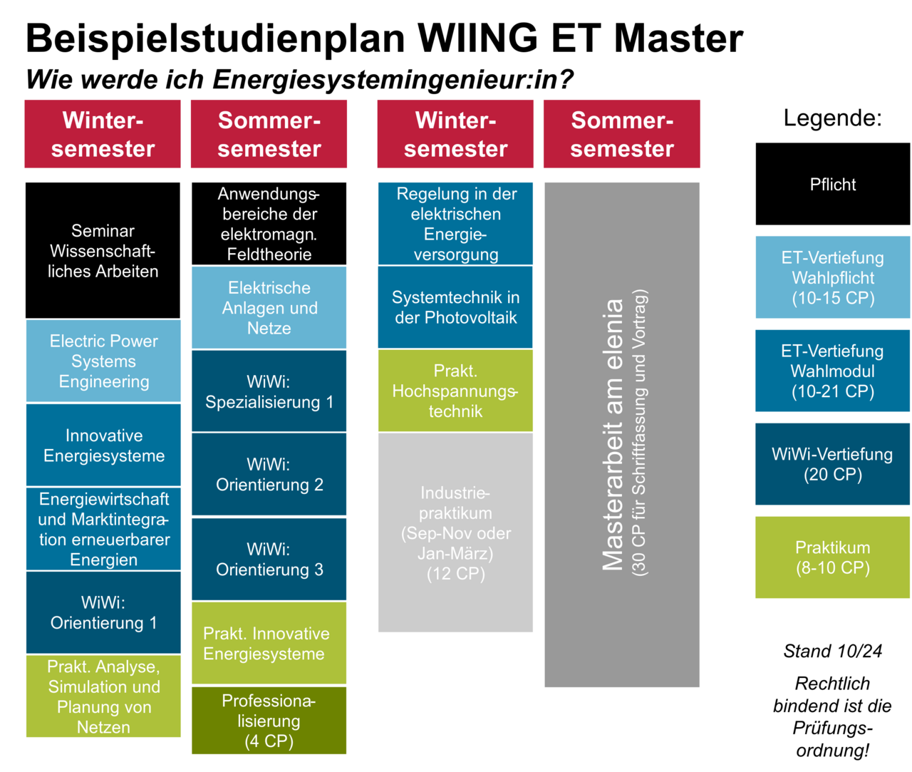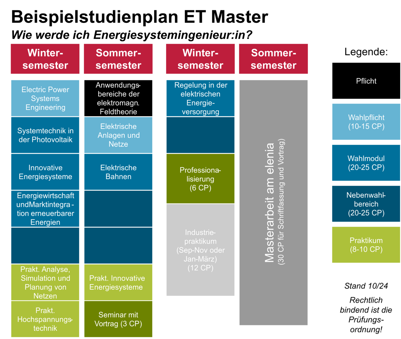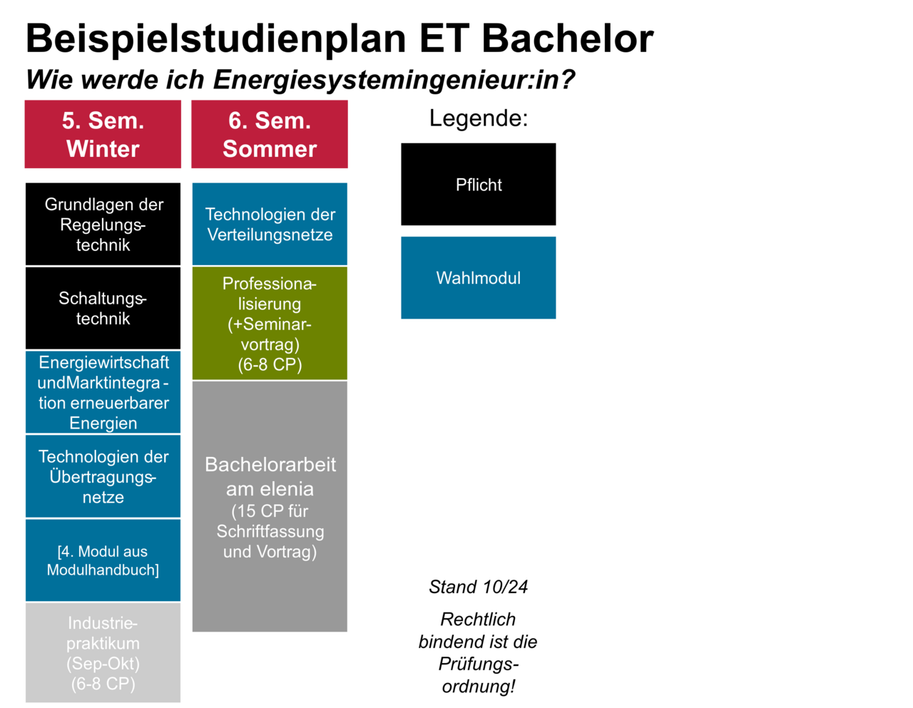 To assist you in your study decisions, you will find various sample study plans here with a focus on energy systems. Sample study plans with a focus on energy technologies will follow. We present one sample study plan for each of the degree programmes listed below. Depending on your interests, you can set a different focus and combine your selection with additional lectures. The aim is not to provide a specific ‘roadmap’ for completing a degree, but rather to give an example of a possible structure for your course of study if you are particularly interested in the field of electrical energy engineering.
