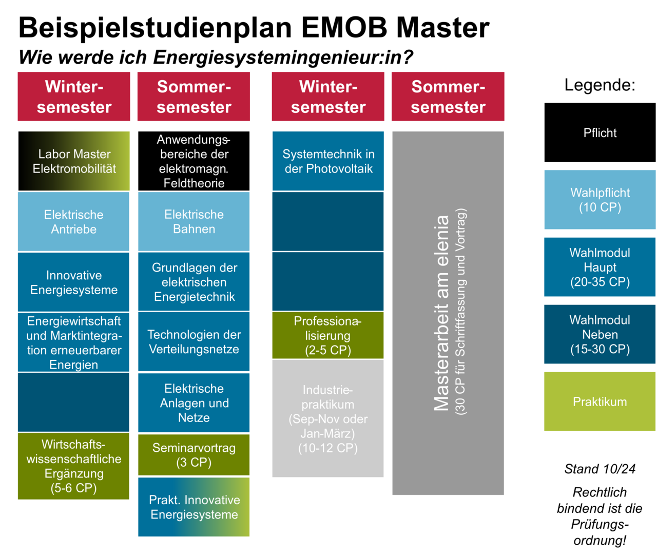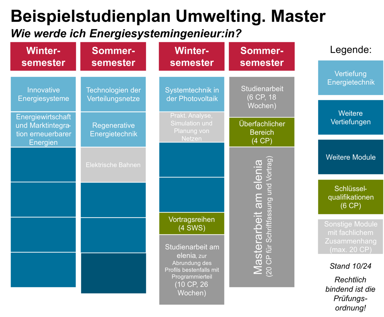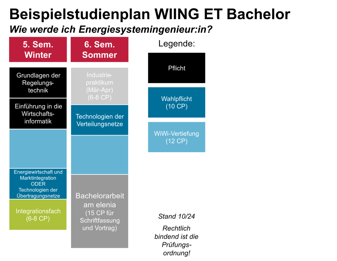 To assist you in your study decisions, you will find various sample study plans here with a focus on energy systems. Sample study plans with a focus on energy technologies will follow. We present one sample study plan for each of the degree programmes listed below. Depending on your interests, you can set a different focus and combine your selection with additional lectures. The aim is not to provide a specific ‘roadmap’ for completing a degree, but rather to give an example of a possible structure for your course of study if you are particularly interested in the field of electrical energy engineering.
