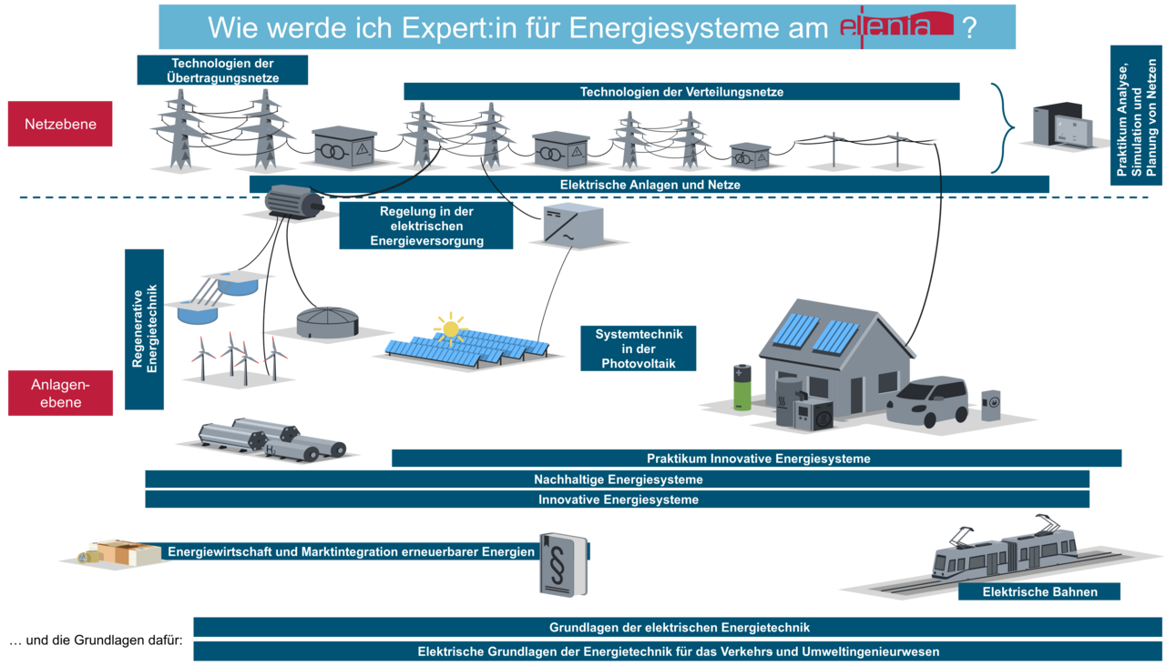 Here you will find an overview of all courses offered at elenia and how they are structured in the fields of energy systems and energy technologies. Details of the courses offered can be found here. Sample study plans can be found further down this page.