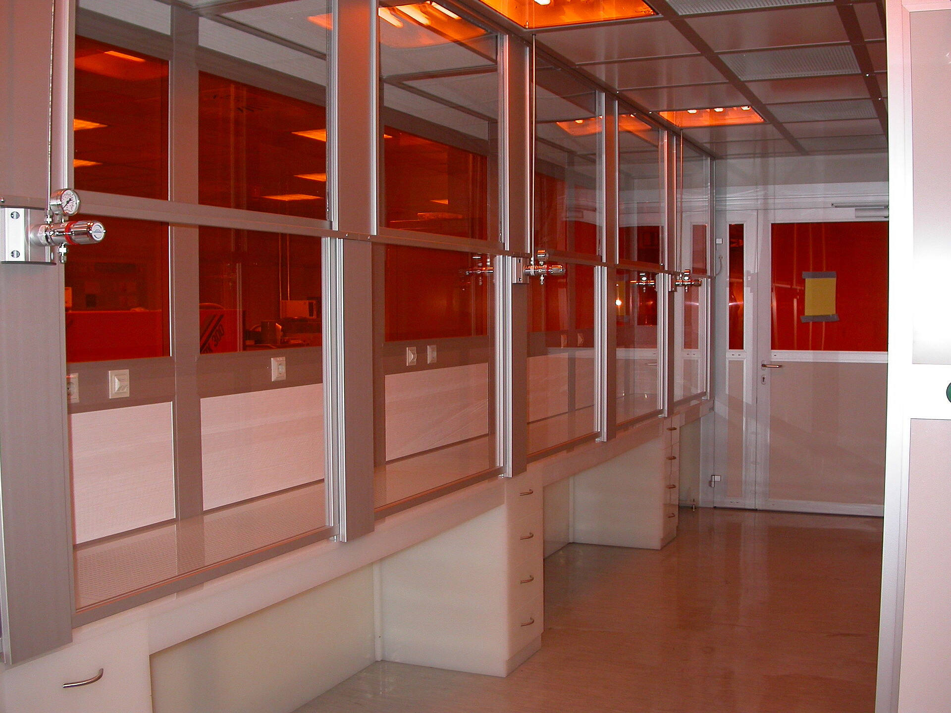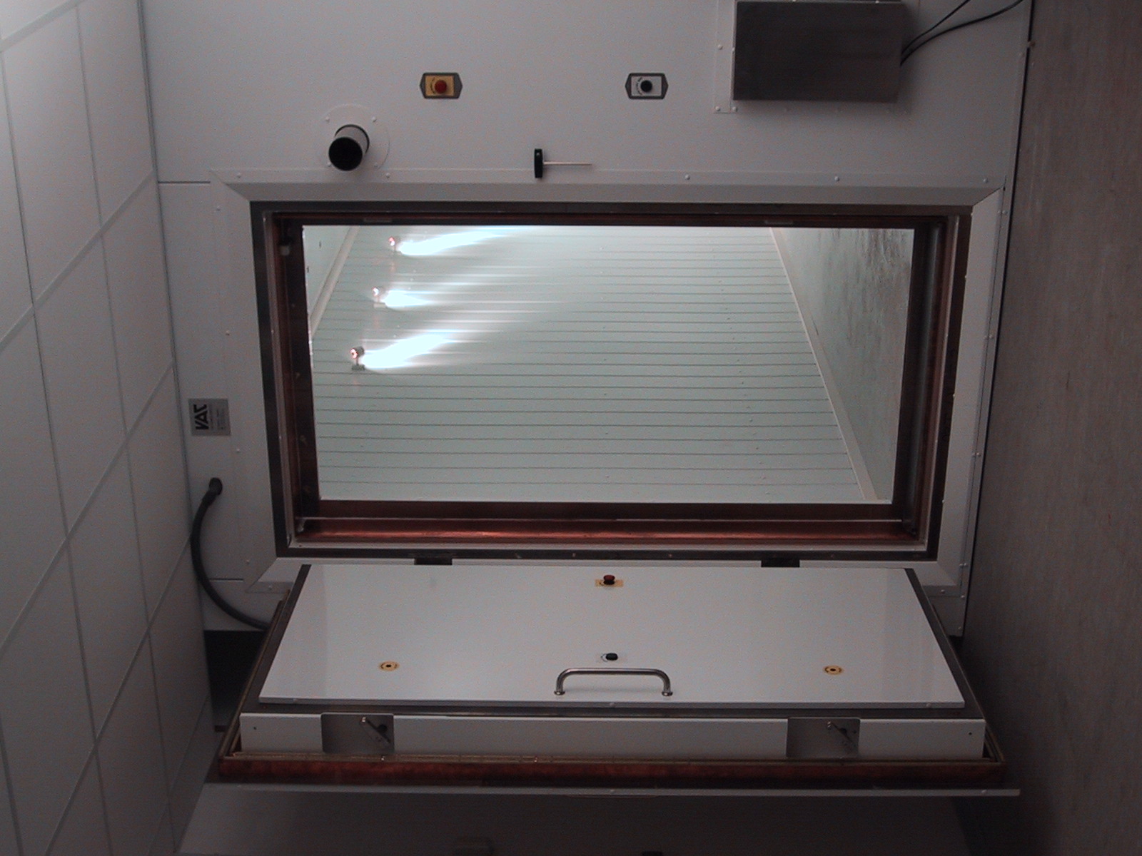 To perform biomagnetic measurements especially on the human brain (so-called magnetoencephalography, EEG), the MSR is equipped with an opening at the front side to optically stimulate the patient via a beamer and with a webcam to watch the patient when lying below the magnetometer system.
