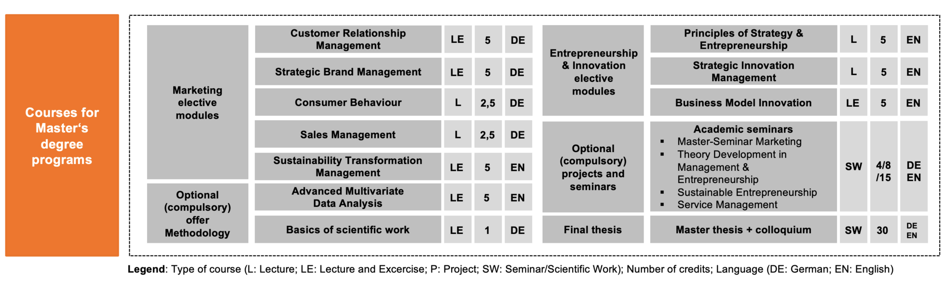 The old Orientation A as a combined examination (120 minutes) consisting of the lectures "Strategic Brand Management" and "Business Model Innovation" can be taken for the last time in the summer semester 2026. From the winter semester 2026/2027 onwards, it will only be possible to enrol in the modules according to the new enrolment logic.