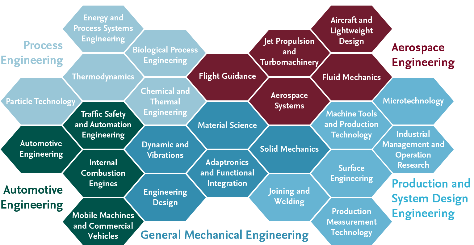 The illustration below gives an overview of the institutes of the Faculty of Mechanical Engineering. It depicts a classification according to the research areas. The relevant areas of specialization (important for the students) is available here. In addition, this brochure provides a short compilation of the scientific activities at Technische Universität Braunschweig, including the institutes of the Faculty of Mechanical Engineering.