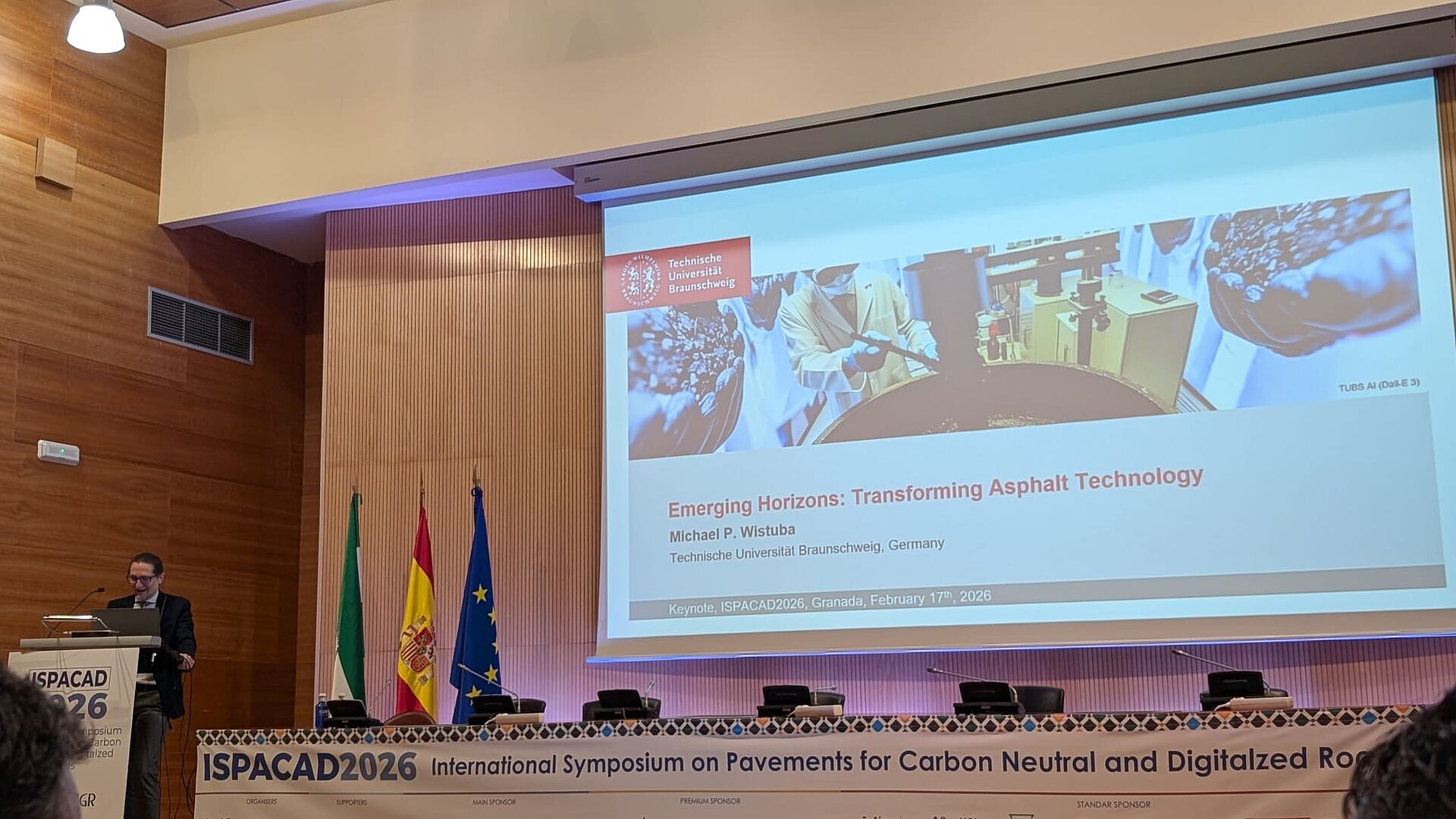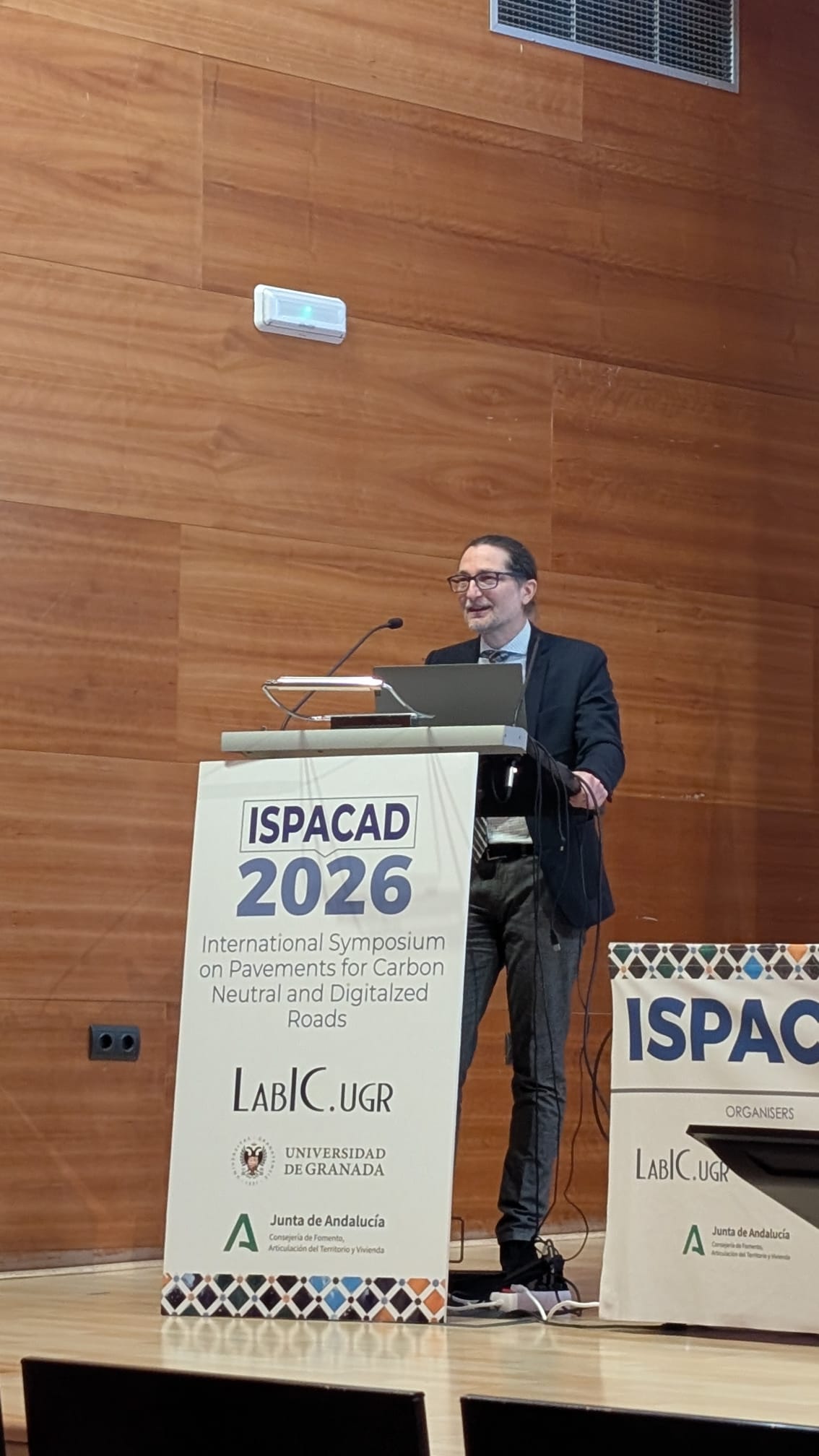 During the ISPACAD2026 – International Symposium on Pavements for Carbon Neutral and Digitalized Roads (17-18.02.2026) held at the University of Granada in Spain, the first keynote lecture was presented by Prof. Wistuba with the title “Emerging Horizons: Transforming Asphalt Technology“. In this presentation, Prof. Wistuba showcased concerns about the carbon footprint of the asphalt pavement industry and the future goals in its reduction, advances in material characterization as well as developments of research already developed at ISBS regarding these topics. Some indicators on the relevance of the lecture’s subject were comments referring to Prof. Wistuba’s keynote speech during discussions in later sessions of the conference. Among other topics presented on ISPACAD2026, digitalization, and material’s development were widely discussed including on the CIRCOPAV EU Project showcase on 18.02.2026, in which ISBS is also part with the I_AM_PAVE and SpongePave projects.