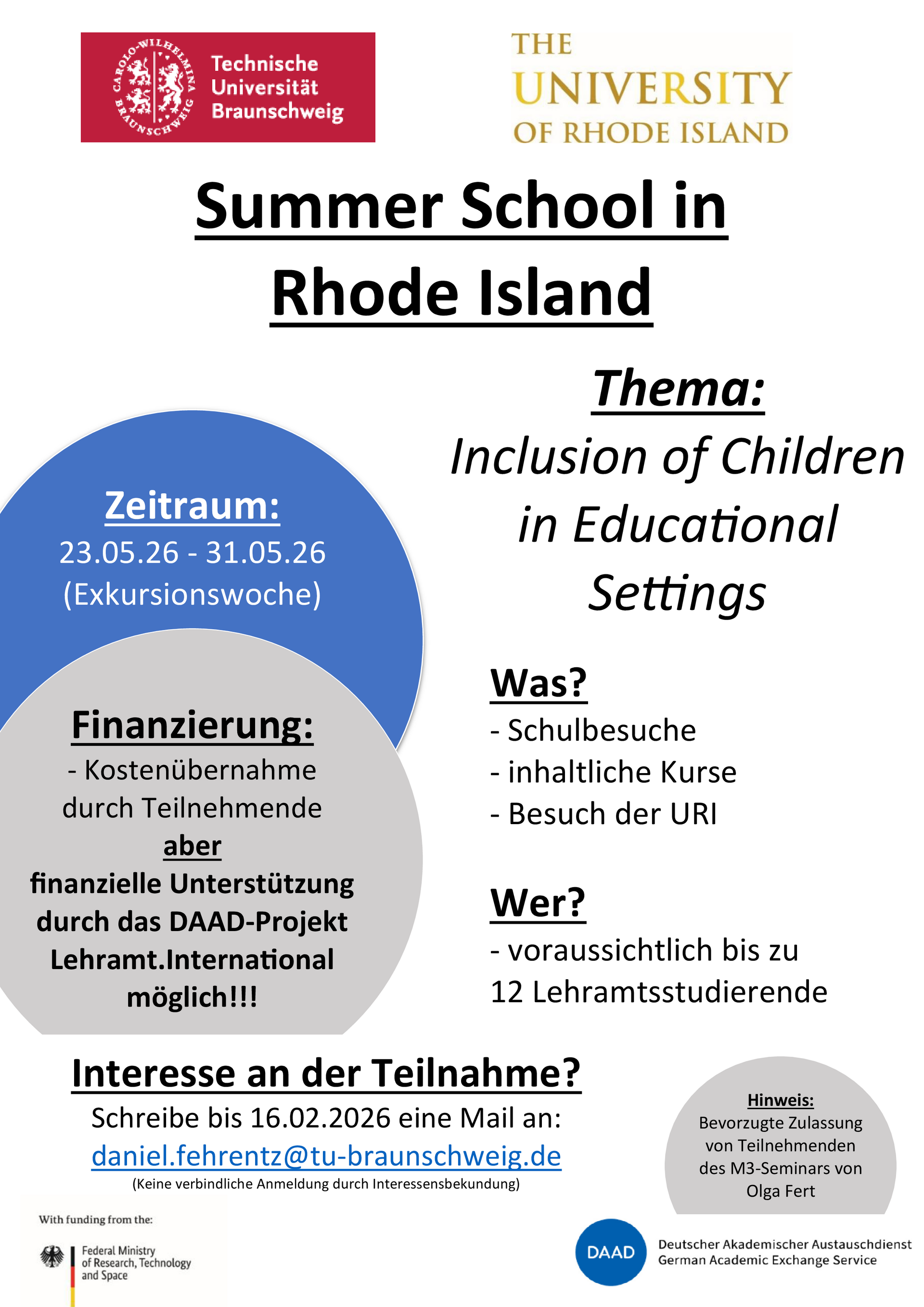 Wenn du Interesse an einer Summer School in Rhode Island hat, dann melde dich bei daniel.fehrentz@tu-braunschweig.de mit einer kurzen Mail. Das ist noch kein Anmeldung sondern eine einfache Interessensbekundung. Damit bleibst du auf dem laufenende über alle weitere Schritte zur Planung und der Summer School.