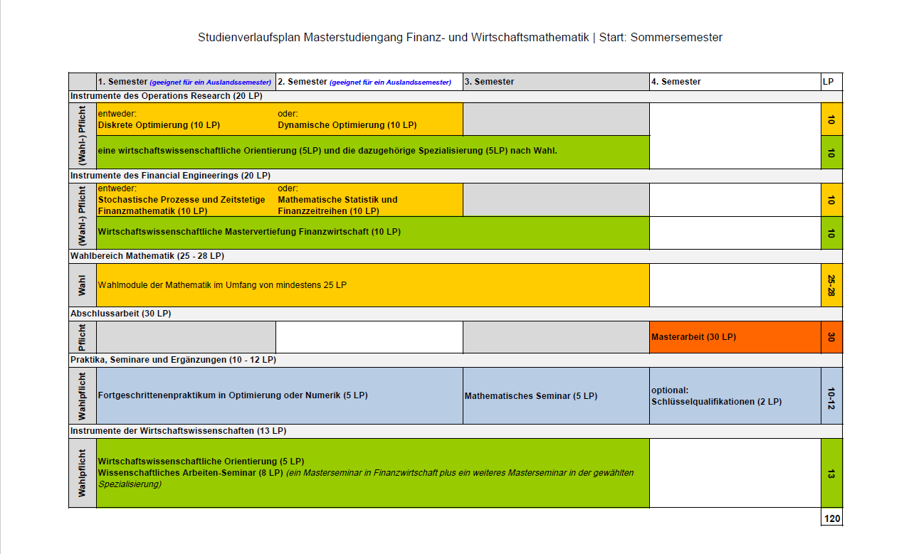 Der Masterstudiengang Finanz- und Wirtschaftsmathematik wird mit 120 Leistungspunkte (LP) abgeschlossen.