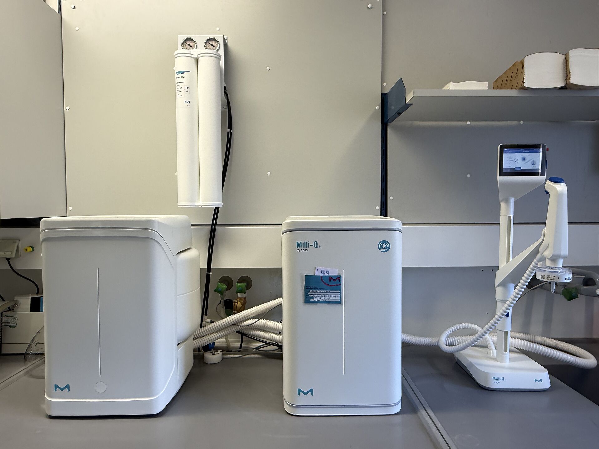 Produziert sowohl Reinst‑ als auch Reinwasser aus Leitungswasser, indem es verschiedenste Aufreinigungsstufen wie Elektrodeionisation, Aktivkohle, UV‑Oxidation und Filtration kombiniert.