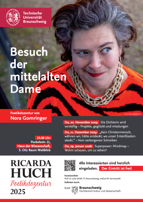 Die Ricarda Huch Poetikdozentur der Technischen Universität Braunschweig dient dem Austausch zwischen Wissenschaft und Öffentlichkeit, zwischen Autor:innen und dem interessierten Lesepublikum. In Vorträgen und Podiumsdiskussionen reflektieren die Poetikdozent:innen über ihr Schreiben, über dessen Bedingungen, über Quellen und Inspiration, über literarische Traditionen und Formen – und über die Literatur an sich. Ricarda Huch gilt als Braunschweigs große Stimme, welche humanistische Tradition und Geschichtsschreibung in die literarische Moderne überführte. Gleichzeitig hat sie als Frau im öffentlichen Leben und in der kulturellen Praxis ihrer Zeit weibliche (und männliche) Identitäten in Frage gestellt.