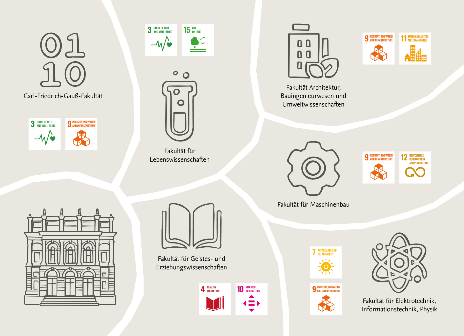 So stellen beispielsweise die Studiengänge Psychologie und Pharmazie an der Fakultät für Lebenswissenschaften einen deutlichen Bezug zu SDG 3 (Gesundheit und Wohlergehen) her – ebenso wie ausgewählte Module der Informatik-Studiengänge an der Carl-Friedrich-Gauß-Fakultät. Die Fakultät für Lebenswissenschaften setzt mit ihren Biologiestudiengängen die fachlichen Grundlagen für SDG 15 (Leben an Land) und verknüpft diese beispielsweise durch Themen der Biotechnologie zusätzlich mit SDG 9. An der Fakultät für Architektur, Bauningenieurwesen und Umweltwissenschaften werden Fragen der Naturwissenschaften mit ökologischer Stadt- und Regionalplanung sowie Nachhaltigkeitsstrategien im Bausektor verknüpft und wichtige Impulse für eine nachhaltige Stadtgestaltung (SDG 11) gesetzt. Die Studiengänge der Fakultät für Maschinenbau untersuchen u.a. nachhaltige Produktionsmuster (SDG 12), während an der Fakultät für Elektrotechnik, Informationstechnik, Physik schwerpunktmäßig innovative Energiesysteme (SDG 7) adressiert werden.