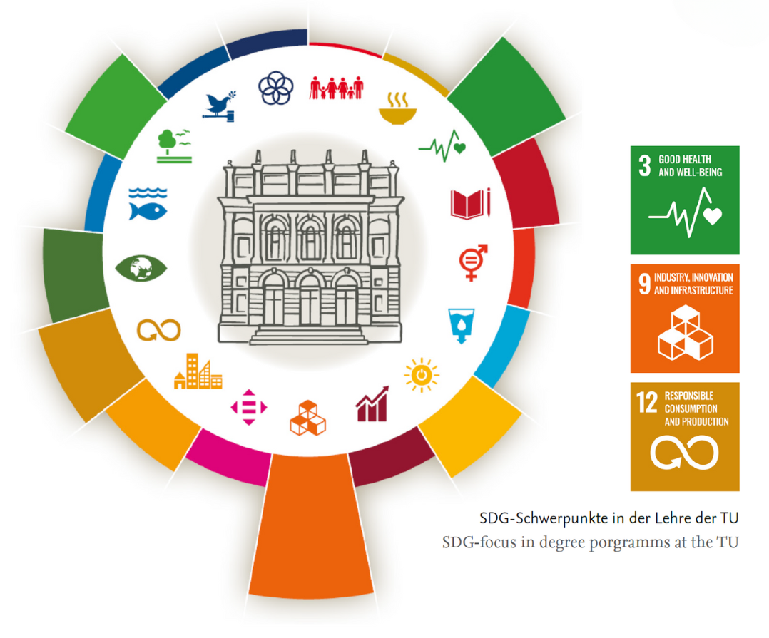 Darüber hinaus tragen die Studieninhalte ebenso zu SDG 13 (Maßnahmen zum Klimaschutz) bei, etwa durch Lehrveranstaltungen zum Umwelt- und Ressourcenschutz, zur Auseinandersetzung mit planetaren Grenzen sowie zu Methoden der Nachhaltigkeitsstrategien und Ökobilanzierung. Auch SDG 3 (Gesundheit und Wohlergehen) wird adressiert – durch Inhalte der Pharmazie und Pharmakologie, pharmazeutische Technologien, sowie durch Ansätze zur Lärmreduktion im Bauwesen, in der Luftfahrt und im Straßenverkehr. Einen weiteren Schwerpunkt bildet SDG 15 (Leben an Land), das durch Themen der Mikrobiologie, der Meteorologie sowie durch Messmethoden zu Austauschprozessen zwischen Boden und Atmosphäre aufgegriffen wird. Weniger vorhanden, aber nicht weniger bedeutend, sind Bezüge zu SDG 6 (Sauberes Wasser) durch Themen wie elektrochemische Reinigungsverfahren oder mikrobiologische Prozesse in der Abwasserbehandlung, zu SDG 8 (Menschenwürdige Arbeit und Wirtschaftswachstum) durch Inhalte zu nachhaltiger Unternehmensführung, Arbeitswissenschaft und Start-up-Recht, sowie zu SDG 11 (Nachhaltige Städte und Gemeinden) durch Fragen von Mobilität, Bau- und Immissionsschutzrecht. Wir werten die Lehrveranstaltung „Indo-German Challenge for Sustainable Production“ als expliziten Beitrag zur globalen und interkulturellen Zusammenarbeit, wodurch zugleich ein zentraler Beitrag zu SDG 17 (Partnerschaften zur Erreichung der Ziele) geleistet wird.