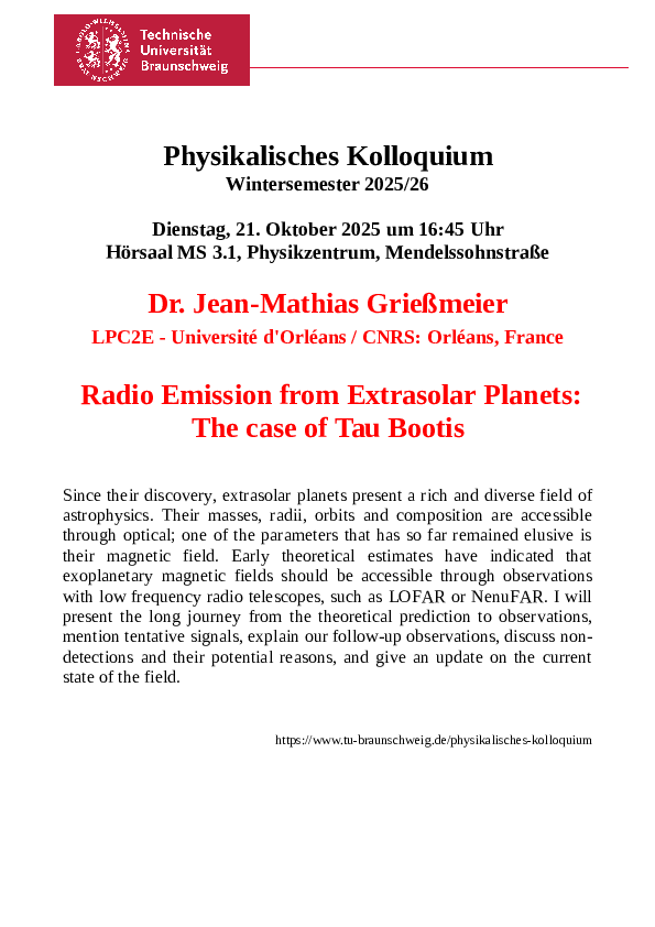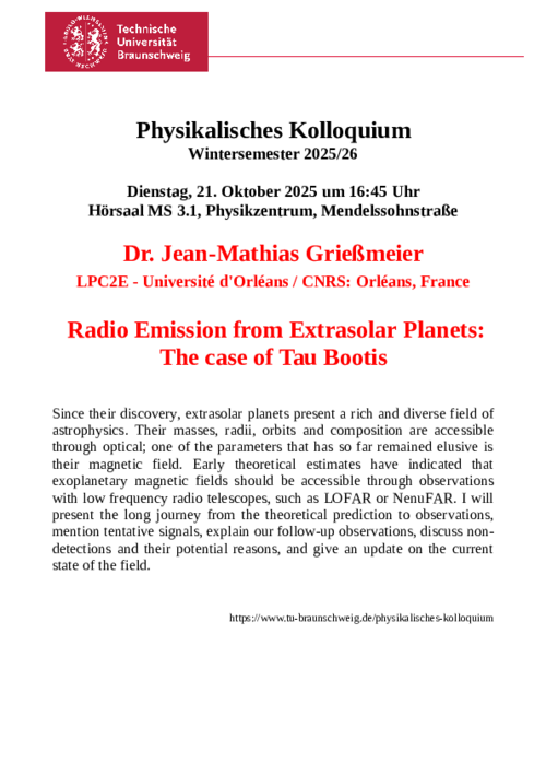 Dr. Jean-Mathias Grießmeier Radio Emission from Extrasolar Planets: The case of Tau Bootis Dienstag, 21. Oktober 2025 um 16:45 Uhr