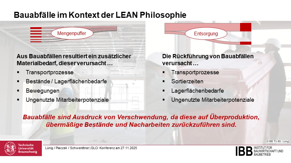 Aus LEAN-Perspektive stellen diese Ineffizienzen Verschwendungen dar, die es zu minimieren gilt. In diesem Zusammenhang wurde Ansätze zur Ableitung von geeigneten Kennzahlen aus Abfalldaten zur Messung des Verschwendungsgrades in Bauprojekten vorgestellt. Dabei wurde aufgezeigt, wie die Anwendung von LEAN-Prinzipien Bauabfälle reduziert und damit sowohl ökonomische Einsparungen als auch ökologische Vorteile ermöglicht. Die Botschaft lautet, dass CO2- und Ressourceneinsparungen auch mit ökonomischen Vorteilen einher gehen.