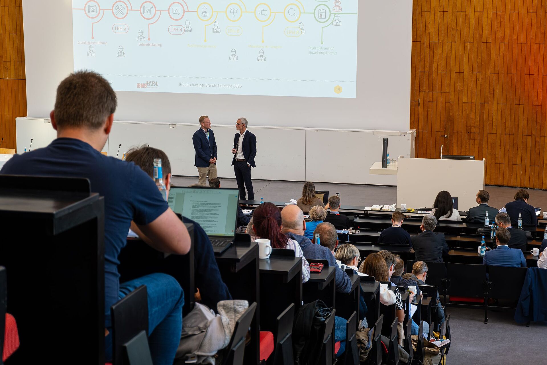 Die 39. Braunschweiger Brandschutz-Tage fanden am 30. September und 01. Oktober 2025 statt. Zur diesjährigen Veranstaltung konnte der Tagungsleiter Prof. Zehfuß, Leiter des Fachgebietes Brandschutz des Instituts für Baustoffe, Massivbau und Brandschutz (iBMB) der Technischen Universität Braunschweig, über 500 Teilnehmende und 35 Fachausstellende begrüßen. Dem Motto „back to the roots“ folgend wurde die Tagung nach 25 Jahren wieder im Audimax der TU Braunschweig durchgeführt.