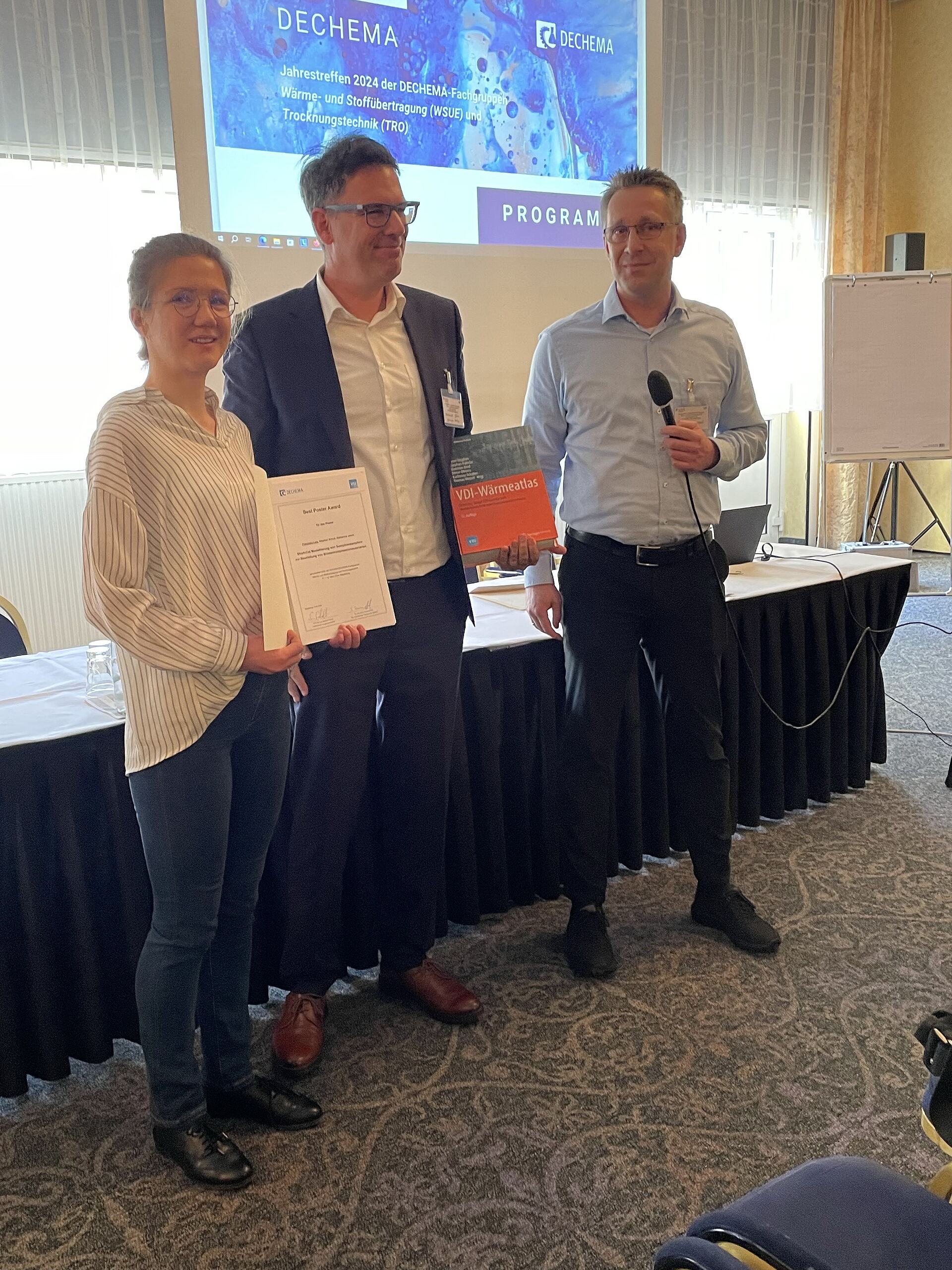 Vom 11.03-13.03.2024 fand in Magdeburg die Dechema Fachgruppentagung der Wärme - und Stoffübertragung und Trocknungstechnik statt. Im Rahmen dieser Konferenz erhielt Frau Franziska Lais den Posterpreis, welches den Titel: "Short-Cut Modellierung von Sumpfverdampfern zur Beurteilung von Brüdenkompressionszenarien" trägt.