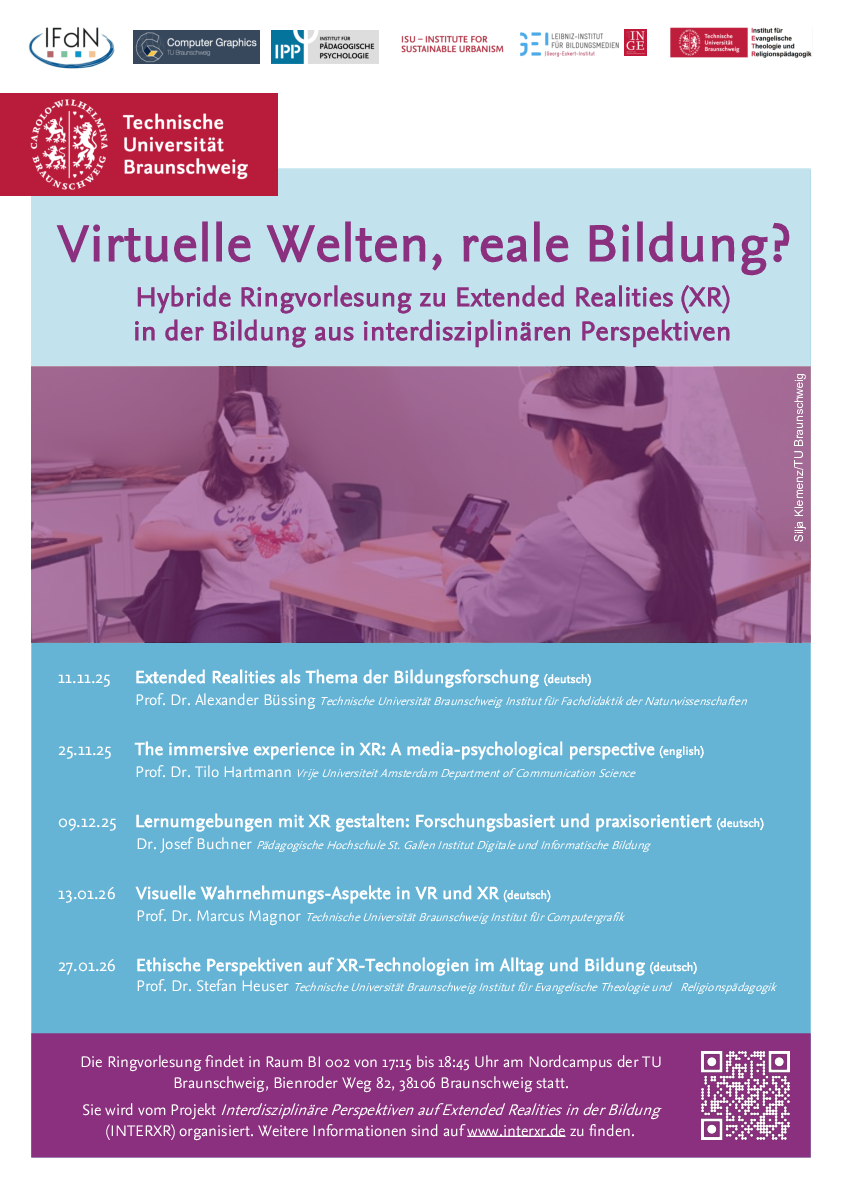 Am 27.01.2026 hielt Prof. Dr. Stefan Heuser aus dem Instiut für evangelische Theologie und Religionspädagogik der TU die letzte Vorlesung des Wintersemesters 25/26 der Ringvorlesung Virtuelle Welten, reale Bildung?. In seiner Vorlesung legte Prof. Heuser einen Fokus auf ethische Aspekte der Virtuellen Realität. In weiteren Vorlesungen wurden von Prof. Dr. Marcus Magnor aus dem Institut für Computergrafik der TU Wahrnehmungsapsekte in XR thematisiert sowie von Prof. Dr. Alexander Büssing aus dem Institut für Fachdidaktik der Naturwissenschaft die Bedeutung von Extended Realities für die Bildungsforschung hervorgehoben. Neben Dozenten der TU haben auch Prof. Dr. Tilo Hartmann vom Department of Communication Science der Vrije Universiteit Amsterdam und Dr. Josef Buchner vom Institut für Digitale und Informatische Bildung der Hochschule St. Gallen einen wertvollen Beitrag geleistet. In der Vorlesung von Prof. Hartmann wurde eine medienpsychologische Perspektive auf immersive Erfahrungen in XR eingenommen und von Dr. Buchner die Gestalttung von XR Lernumgebungen eine zentrale Bedeutung zugeschrieben.
