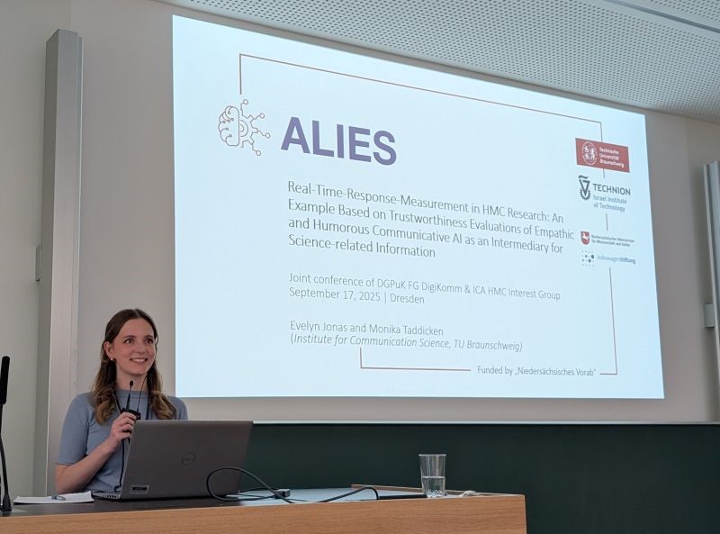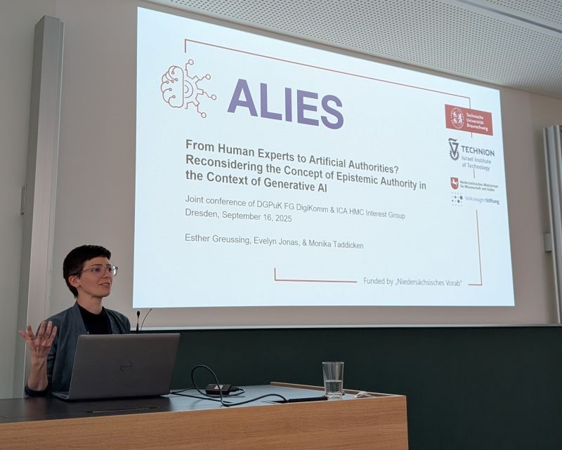 Vom 15. bis 17. September fand in Dresden die erste gemeinsame Tagung der Fachgruppe Digitale Kommunikation der Deutschen Gesellschaft für Publizistik- und Kommunikationswissenschaft (DGPuK) und der HMC-Interest-Group der International Communication Association (ICA) statt. Im Fokus der vom Institut für Kommunikationswissenschaft der TU Dresden organisierten Konferenz lagen dabei Maschinen, die in der digitalen Kommunikation als Akteure fungieren. Monika Taddicken, Esther Greussing und Evelyn Jonas stellten dabei Ergebnisse im Rahmen des ALIES-Projekt vor: