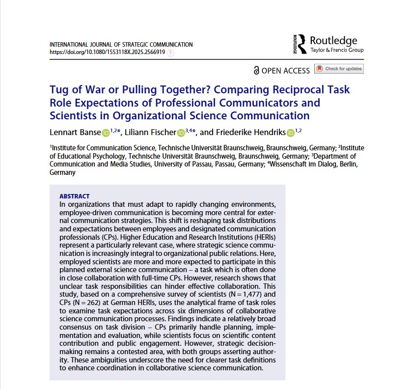 Lennart Banse und Friederike Hendriks haben gemeinsam mit Liliann Fischer einen Beitrag im International Journal of Strategic Communication veröffentlicht. Mithilfe einer Befragung von Wissenschaftler*innen und Kommunikationsexpert*innen und einem analytischen Framework von Aufgabenrollen untersuchen die Autor*innen die Aufgabenanforderungen an Wissenschaftler*innen an deutschen Hochschul- und Forschungseinrichtungen in sechs Dimensionen der kollaborativen Wissenschaftskommunikationsprozesse. Die Ergebnisse zeigen zwar eine allgemeine Übereinstimmung hinsichtlich der Aufgabenverteilung, offenbaren aber auch die Notwendigkeit eindeutigerer Aufgabenbeschreibungen, um die Koordination in der kollaborativen Wissenschaftskommunikation zu verbessern.