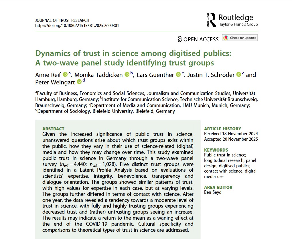 Anne Reif, Monika Taddicken, Lars Guenther, Justin Schröder und Peter Weingart haben einen Beitrag im Journal of Trust Research veröffentlicht. Die Studie untersucht das Vertrauen der Öffentlichkeit in Wissenschaft in Deutschland mithilfe einer zweistufigen Panelbefragung. Dabei wurden in einer Latent Profile Analyse fünf verschiedene Vertrauensgruppen identifiziert, die auf der Bewertung von Expertise, Integrität, Wohlwollen, Transparenz und Dialogorientierung von Wissenschaftler*innen basieren. Die Ergebnisse zeigen, dass die Gruppen ähnliche Vertrauensmuster aufweisen, diese in ihren Niveaus jedoch variieren. Nach einem Jahr zeigte sich eine Tendenz zu einem moderaten Vertrauen in Wissenschaft, wobei Gruppen mit hohem Vertrauen einen Rückgang in Vertrauen verzeichneten, während in misstrauischen Gruppen die Skepsis stieg.