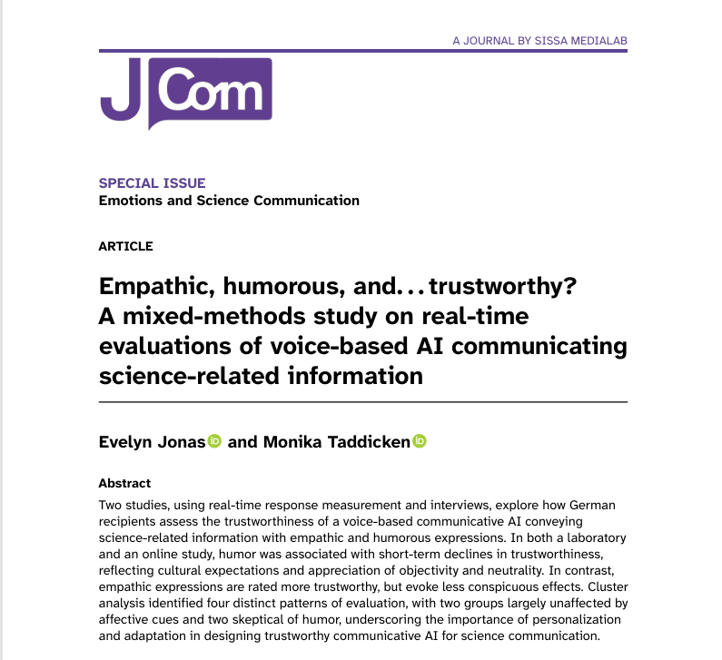 Evelyn Jonas hat gemeinsam mit Monika Taddicken einen Beitrag im Journal of Science Communication veröffentlicht. In den zwei Studien untersuchen sie mithilfe von Echtzeitmessungen, wie deutsche Rezipient*innen die Vertrauenswürdigkeit einer sprachbasierten kommunikativen KI bewerten, die wissenschaftsbezogene Informationen mit einfühlsamen und humorvollen Ausdrücken vermittelt. Die Ergebnisse legen nahe, dass Humor mit einem kurzzeitigen Rückgang an Vertrauenswürdigkeit einhergeht, während einfühlsame Ausdrücke als vertrauenswürdiger bewertet wurden. Die Clusteranalyse idenitifizierte vier unterschiedliche Bewertungsmuster, wobei sich zwei Gruppen weitgehend unbeeindruckt von affektiven Signalen zeigten und zwei Gruppen Humor skeptisch gegenüberstanden. Diese Erkenntnisse betonen, wie bedeutend Personalisierung und Anpassung bei der Gestaltung vertrauenswürdiger kommunikativer KI für die Wissenschaftskommunikation sind.