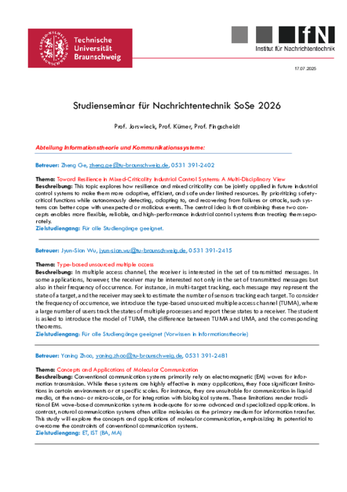 Zeit: Do 16:00-18:00 (pro Semester gibt es 6 Termine. Diese werden im Stud.IP (Veranstaltung: Studienseminar für Nachrichtentechnik) bekanntgegeben.