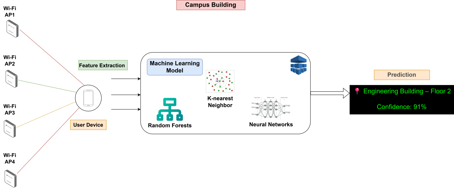 The architecture relies exclusively on existing wireless infrastructure and commodity devices, enabling deployment across large building complexes without additional hardware investment. Lightweight processing and modular design allow the system to scale to many users while maintaining low operational complexity and maintenance cost.