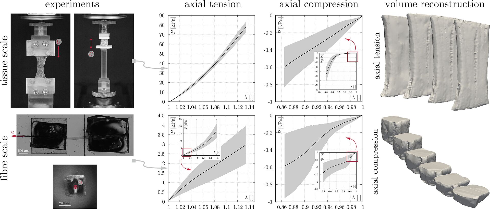 In comparison to the tissue level, this asymmetric behaviour is more pronounced at the fibre scale, elucidating the load transfer mechanism in muscle tissue and aiding in the development of future modelling strategies.