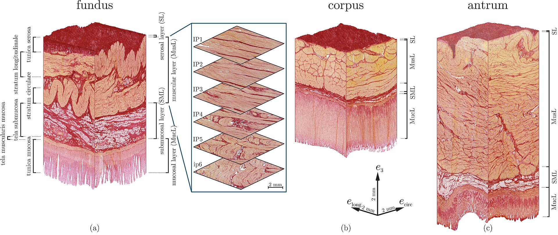 Furthermore, realistic model predictions require the determination of the microstructure and composition of these tissue strips by means of immunohistological investigations. In addition, the active experiments on the whole stomach necessary for validating the whole stomach model will be carried out by measuring the whole stomach deformation and the generated internal pressures.
