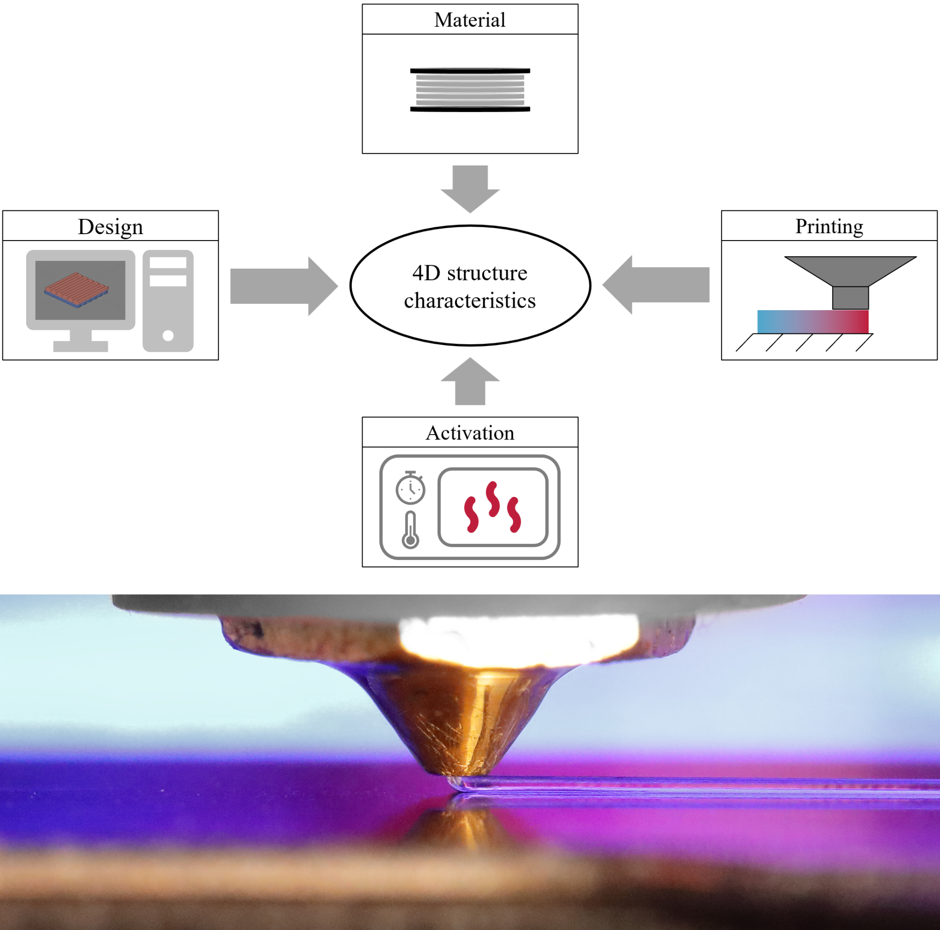 The goal of the project is to simulate shape memory behavior and enable structural design as well as the identification of key process parameters for 4D-printed shape memory structures. The project aims to analyze the entire process chain—from material selection and design to printing parameters and stimulus activation parameters. This is intended to bring 4D printing a step closer to industrial application.