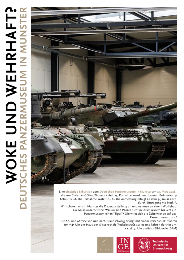 Am 25. März 2026 findet eine eintägige Exkursion zum Deutschen Panzermuseum in Munster statt, die von Christian Götter, Thomas Kubetzky, Daniel Jankowski und Lennart Bohnenkamp betreut wird. Die Teilnahme kostet 10,- €. Die Anmeldung erfolgt ab dem 5. Januar 2026 durch Eintragung bei StudIP.