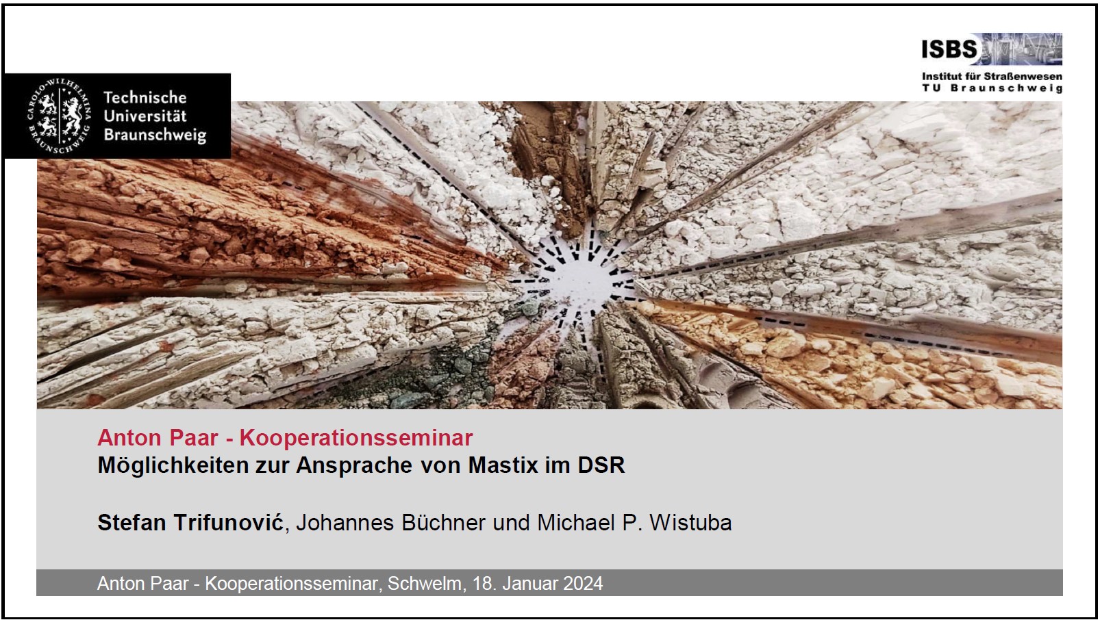 Das Kooperationsseminar "DSR Bitumenprüfungen" wird von Anton Paar gemeinsam mit der Ruhr-Universität Bochum und der Technischen Universität Dresden mit jährlichen Standortwechsel (Bochum/Dresden) angeboten. Am 17. und 18. Januar fand die diesjährige Veranstaltung in Schwelm statt. Stefan Trifunovic berichtete am 18. Januar mit dem Titel "Möglichkeiten zur Ansprache von Mastix im DSR" von unserer aktuellen Forschung. Dabei wurden wesentliche Inhalte des in Kürze zu Ende laufenden und im Auftrag der Bundesanstalt für Straßenwesen durchgeführten Forschungsprojekts RHEMAS („Optimierung von Verfahren zur Prüfung von Füller-Bitumen-Gemischen mit dem Dynamischen Scherrheometer“, FE 07.0317/2021/AGB) vorgestellt.