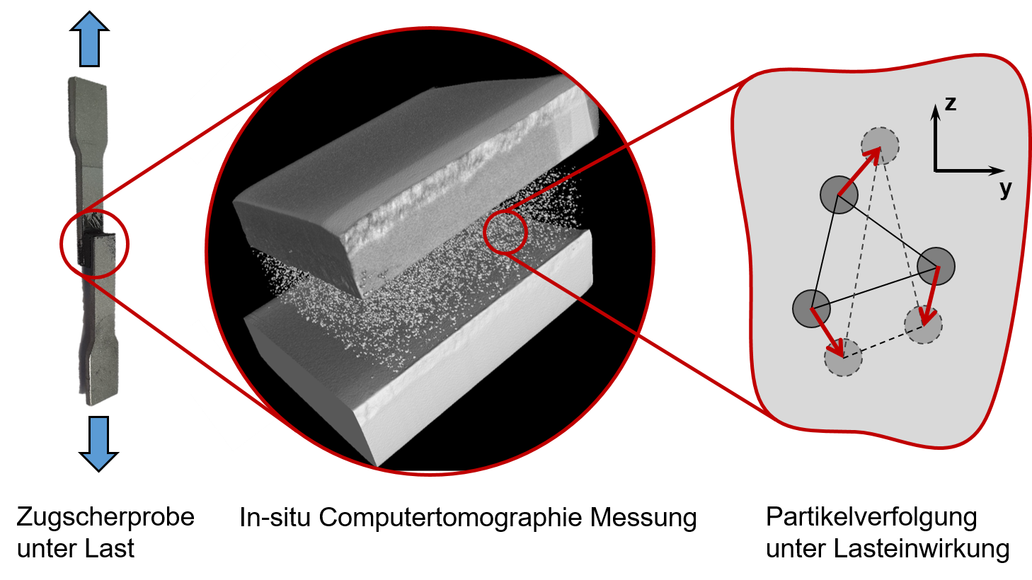 Im Rahmen des Forschungsprojektes LoKAl (IGF 19839N) wird am Institut für Füge- und Schweißtechnik der TU Braunschweig (ifs) eine Methode für die lokale Verformungsanalyse elastischer Klebverbindungen entwickelt. Hierdurch können Spannungs- bzw. Dehnungszustände innerhalb von Klebungen mit einer hohen örtlichen Auflösung detektiert werden. Das Prinzip beruht auf der Partikelverfolgung von im Klebstoff eingebrachten Markerpartikeln mittels in-situ Computertomographie Messungen. Durch diese neuartige Messmethodik ist eine Messung an Klebungen bei unterschiedlichen Beanspruchungen möglich. Unter Verwendung eines auf Klebungen optimierten Parametersatzes sowie Messaufbaus ist es gelungen, sowohl die Klebstoffmatrix als auch die im Klebstoff eingebetteten Markerpartikel nahezu artefaktfrei abzubilden und enthaltene Kavitäten eindeutig zu detektiert. Ziel ist es, diese Methode zur direkten hochaufgelösten Dehnungsmessung in Klebschichten zu erforschen und dadurch neue Auslegungsmöglichkeiten von Klebungen zu eröffnen, wodurch der experimentelle Aufwand zur Kennwertermittlung erheblich reduziert wird. Das aus den Ergebnissen resultierende bessere Materialverständnis schafft zudem neue, bessere Modellierungs- und Simulationsmöglichkeiten.