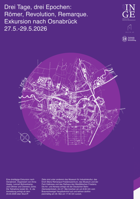 Vom 27. bis zum 29. Mai 2026 findet eine dreitägige Exkursion nach Osnabrück statt, die von Anna Haake, Lennart Bohnenkamp, Jost Othmer und Clemens Janke betreut wird. Die Teilnahme kostet 30,- €, die Anmeldung erfolgt über Stud.IP.