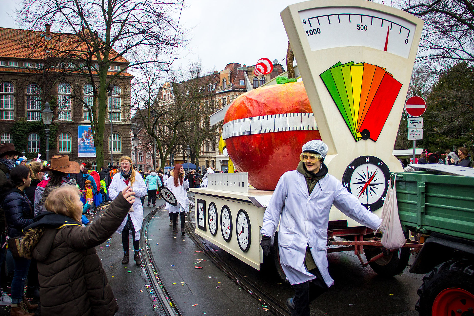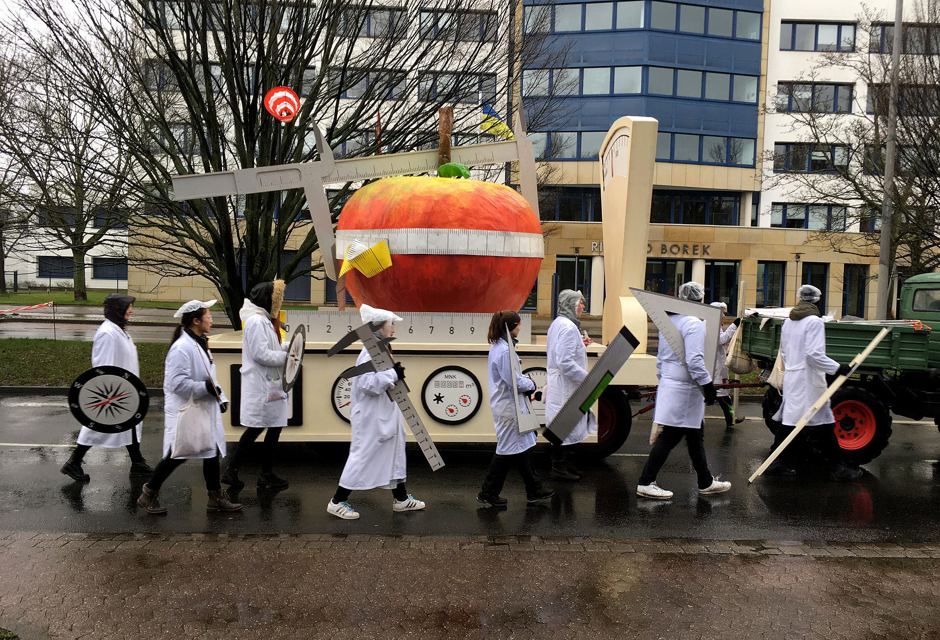 Die Fußgruppe, verkleidet als Wissenschaftler/Forscher, begleitet bei teils strömendem Regen den Wagen mit mobilen Messinstrumenten, um auch das Karnevalspublikum mit einzubeziehen. So vermessen Schieblehren, Lineale und andere Messinstrumente, Nase, Köpfe und Körper der Besucher des Umzugs.