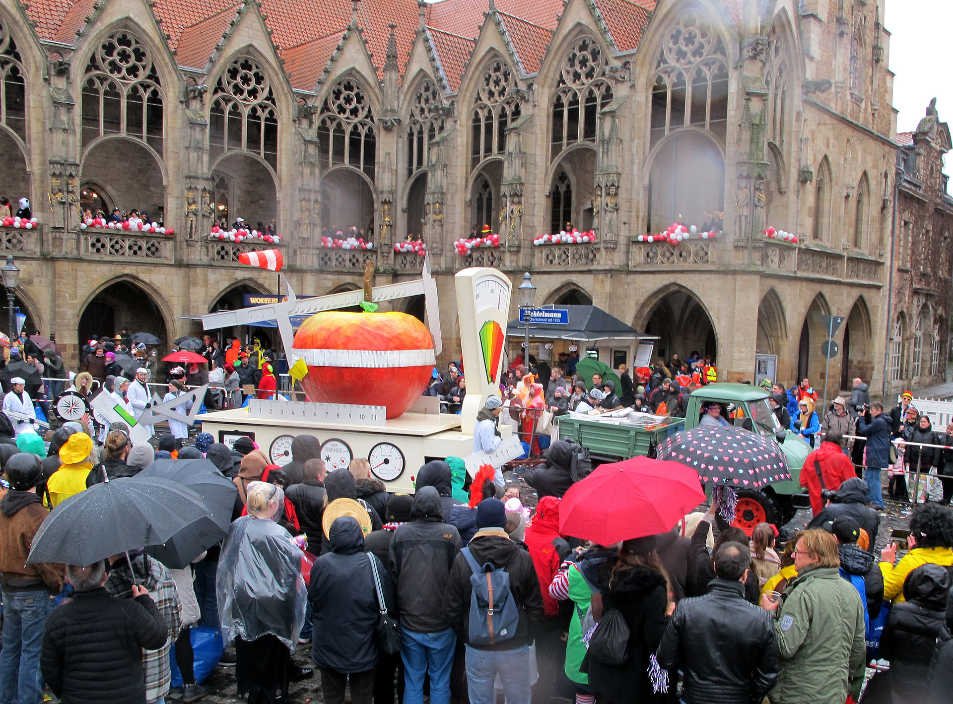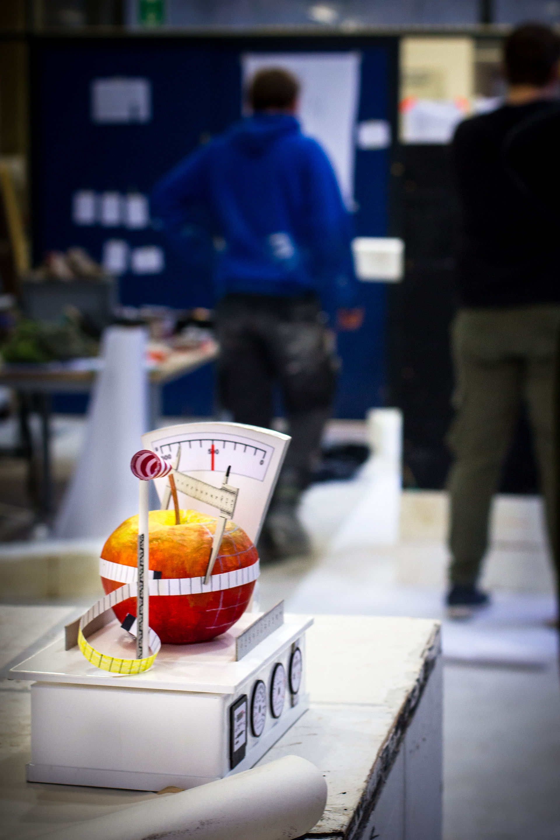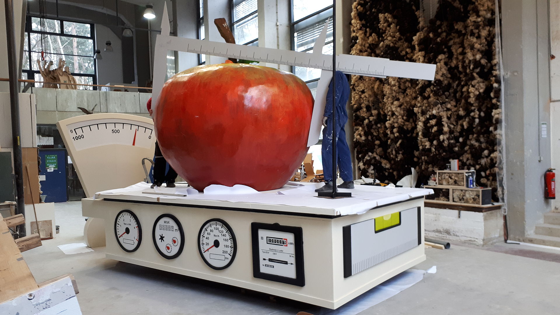 „Ist das noch NORMal?" Der neue Schoduvel-Wagen des IAK (Institut für Architekturbezogene Kunst) ist bestückt mit Messinstrumenten, die die völlige Vermessung unserer Welt thematisieren. Der idealisierte Normapfel liegt auf einer großen Waage und wird gleichzeitig mit den unsinnigsten Messinstrumenten überprüft. Dadurch wird unser Normierungssystem ad absurdum geführt.