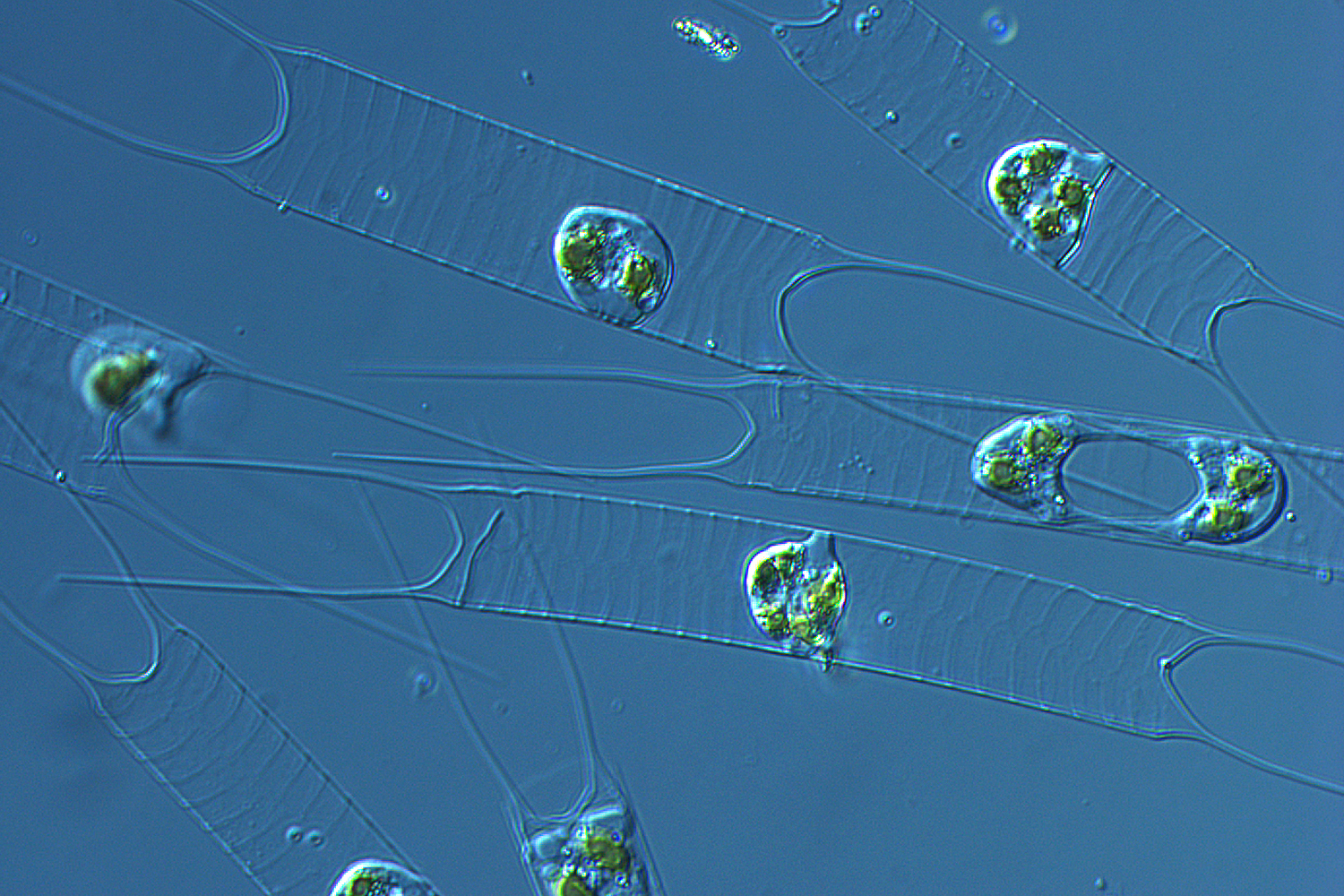 Das Bild des Monats September ist eine Überraschung für die Wissenschaftlerinnen und Wissenschaftler des Instituts für Geosysteme und Bioindikation (IGeo) der Technischen Universität Braunschweig: In einer kürzlich genommenen Wasserprobe aus dem Braunschweiger Spielmannsteich ist eine Massenentwicklung, eine sogenannte „Blüte“, der Kieselalge Acanthoceras zachariasii zu sehen. Aufgenommen hat sie Dr. Anja Schwarz, wissenschaftliche Mitarbeiterin am IGeo, an einem Zeiss-Forschungsmikroskop bei 400-facher Vergrößerung.