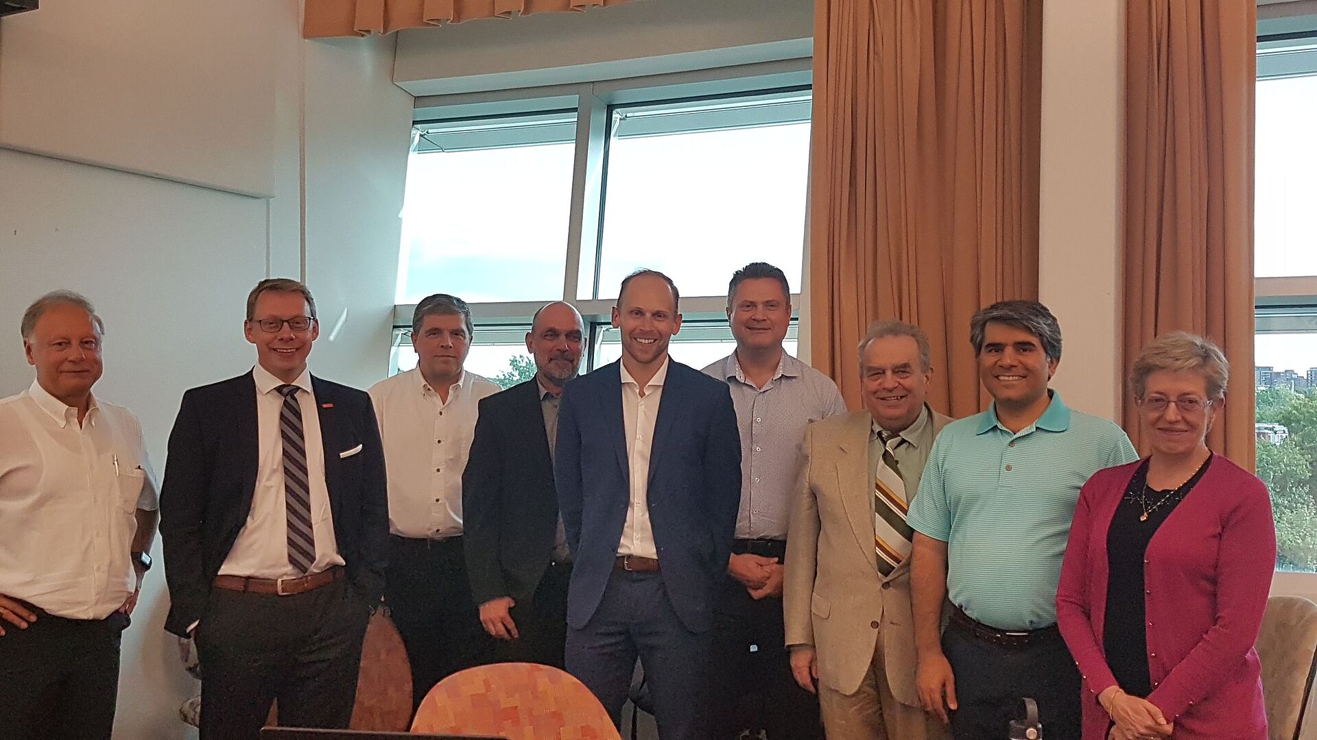 Bild 2: Bei der Verteidigung der Dissertation. In der Bildmitte: Dr. Jacob Stolle, 2. von links: Prof. Nils Goseberg, 4. von links: Prof. Jochen Aberle, 6. von links: Prof. Ioan Nistor. (Das Foto ist vor der Corona-Pandemie entstanden.) Foto: Alicia Martin/University of Ottawa