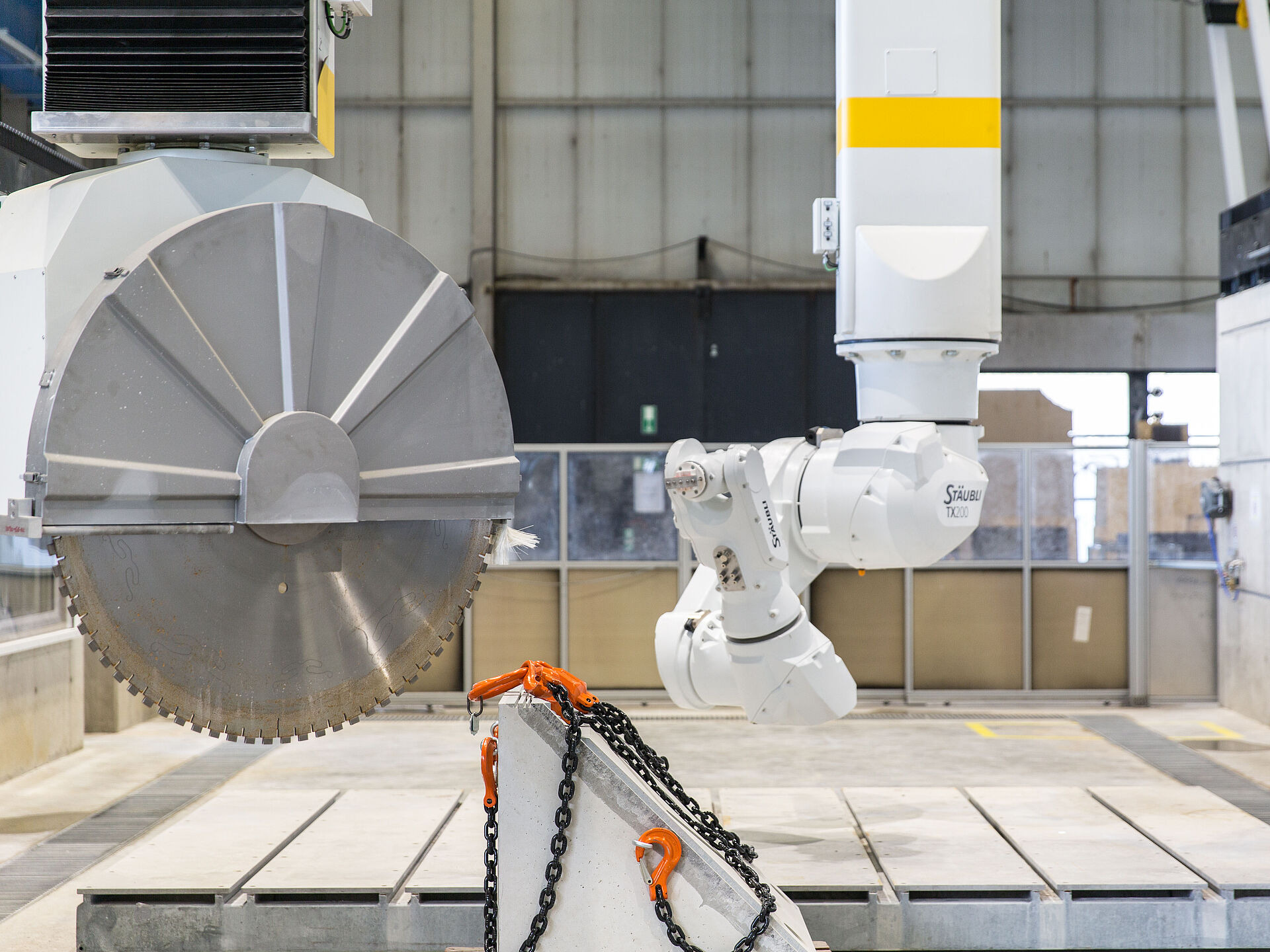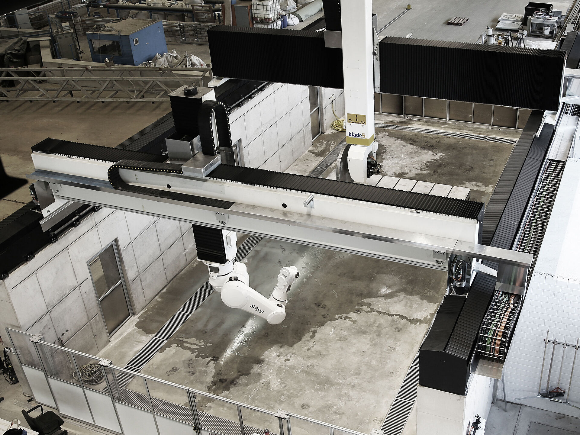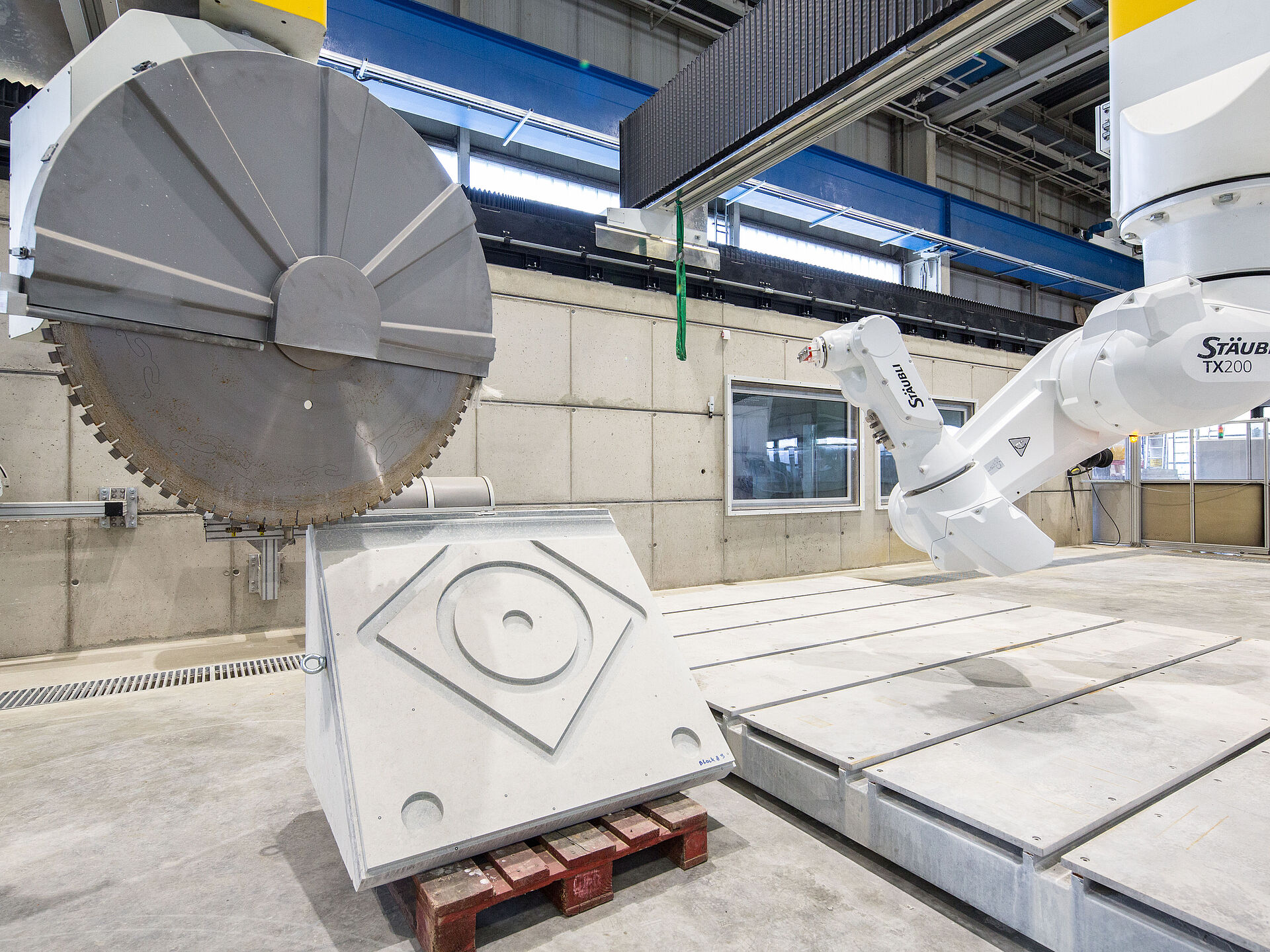 The DBFL combines the high stiffness and precision of conventional machining centers with the flexibility of robotic systems. It supports additive manufacturing (e.g., concrete spraying), subtractive processing of high-strength materials, optical surface inspection, and dynamic handling processes such as pick-and-place. Multiple freely orientable tool heads enable synchronized or closely sequenced cooperative manufacturing under harsh environmental conditions with sensor-based monitoring. A large workspace allows the production of full-scale architectural components.